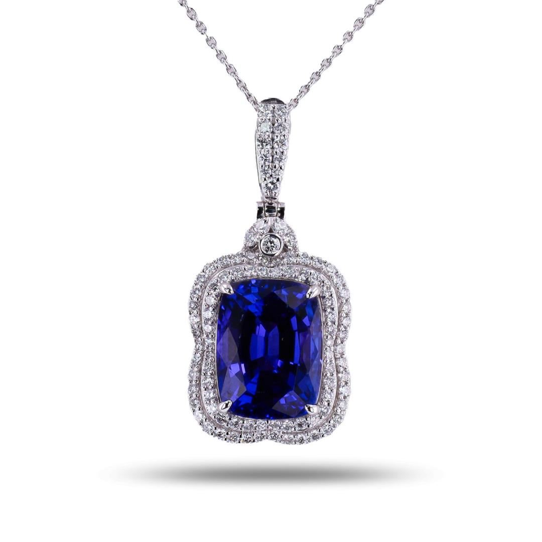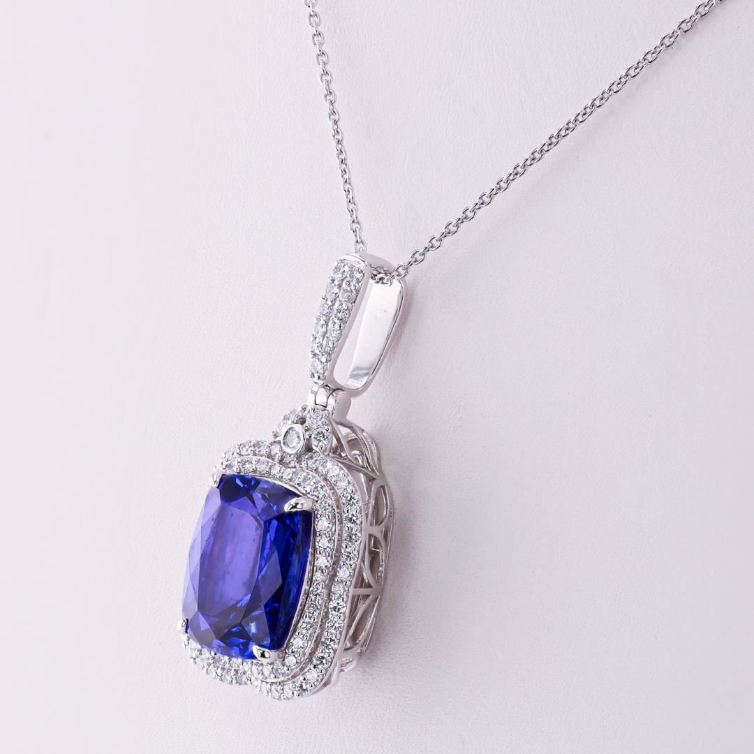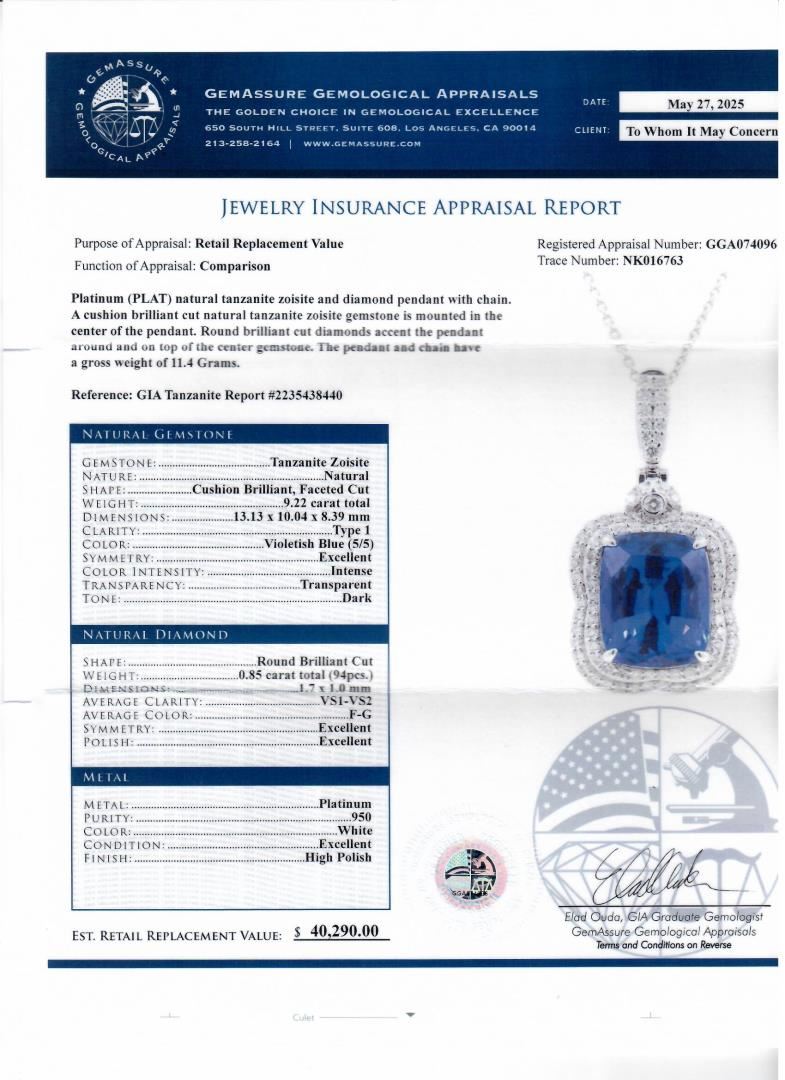 Platinum (PLAT) natural tanzanite zoisite and diamond pendant with chain. A cushion brilliant cut natural tanzanite zoisite gemstone is mounted in the center of the pendant. Round brilliant cut diamonds accent the pendant around and on top of the center gemstone. The pendant and chain have a gross weight of 11.4 Grams. Reference: GIA Tanzanite Report 2235438440 #NATURAL GEMSTONE# GEMSTONE: Ianzanite Zoisite; NATURE: Natural; SHAPE: Cushion Brilliant, Faceted Cut; WEIGHT: 9.22 carat total; DIMENSIONS: 13.13 x 10.04 x 8.39mm; CLARITY: Type 1; COLOR: Violetish Blue (5/5); SYMMETRY: Excellent; COLOR INTENSITY: Intense; TRANSPARENCY: Transparent; TONE: Dark #NATURAL DIAMOND# SHAPE: Round Brilliant Cut; WEIGHT: 0.85 carat total (94pcs.); DIMENSIONS: 1.7 x 1.0mm; AVERAGE CLARITY: VS1-VS2; AVERAGE COLOR: F-G; SYMMETRY: Excellent; POLISH: Excellent #METAL# METAL: Platinum; PURITY: 950; COLOR: White; CONDITION: Excellent; FINISH: High Polish #Size: 17