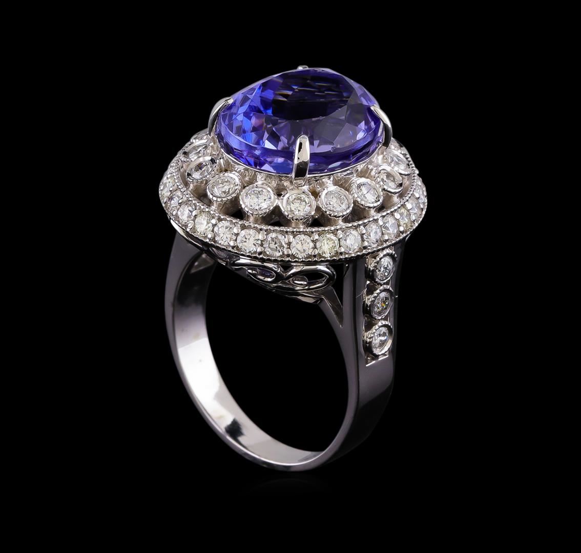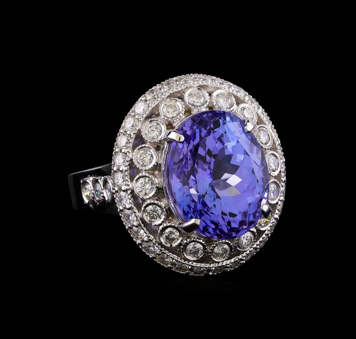 One electronically tested 14KT white gold lady's cast fashion ring with a double basket halo with a bright polish with milgrain detailing finish. The featured lady's has a shank measuring 3.11 millimeters in width. Identified with markings of "K14". Condition is new, good workmanship. Containing: One prong set oval modified brilliant cut natural tanzanite, measuring 13.15 x 10.74 x 9.02mm, (depth est.) approximate weight of 9.23ct., clarity is eye clean, medium light, moderately strong, violetish blue color, (GIA vB 4/4), cut is very good. Transmitting light with no distortion, transparent. Colored gemstones are presumed to have been subjected to commonly used enhancement processes. Graded in the setting. Twenty-Two bezel set round brilliant cut diamonds, measuring 1.95 - 1.90 x 1.20mm (depth est.) approximate total weight of 22 Stones = 0.60ct. Graded in the setting. Clarity: SI-1 to I-1. Color: H - I. Cut Good Thirty prong set round brilliant cut diamonds, measuring 1.85 - 1.75 x 1.12mm (depth est.) approximate total weight of 30 Stones = 0.67ct. Graded in the setting. Clarity: SI-1 to SI-2. Color: H - I. Cut Good. Total Weight of Colored Stones 9.23ct. Total Weight of Diamonds 1.27ct. Total Weight of Ring 9.60gm. GAS Appraised.