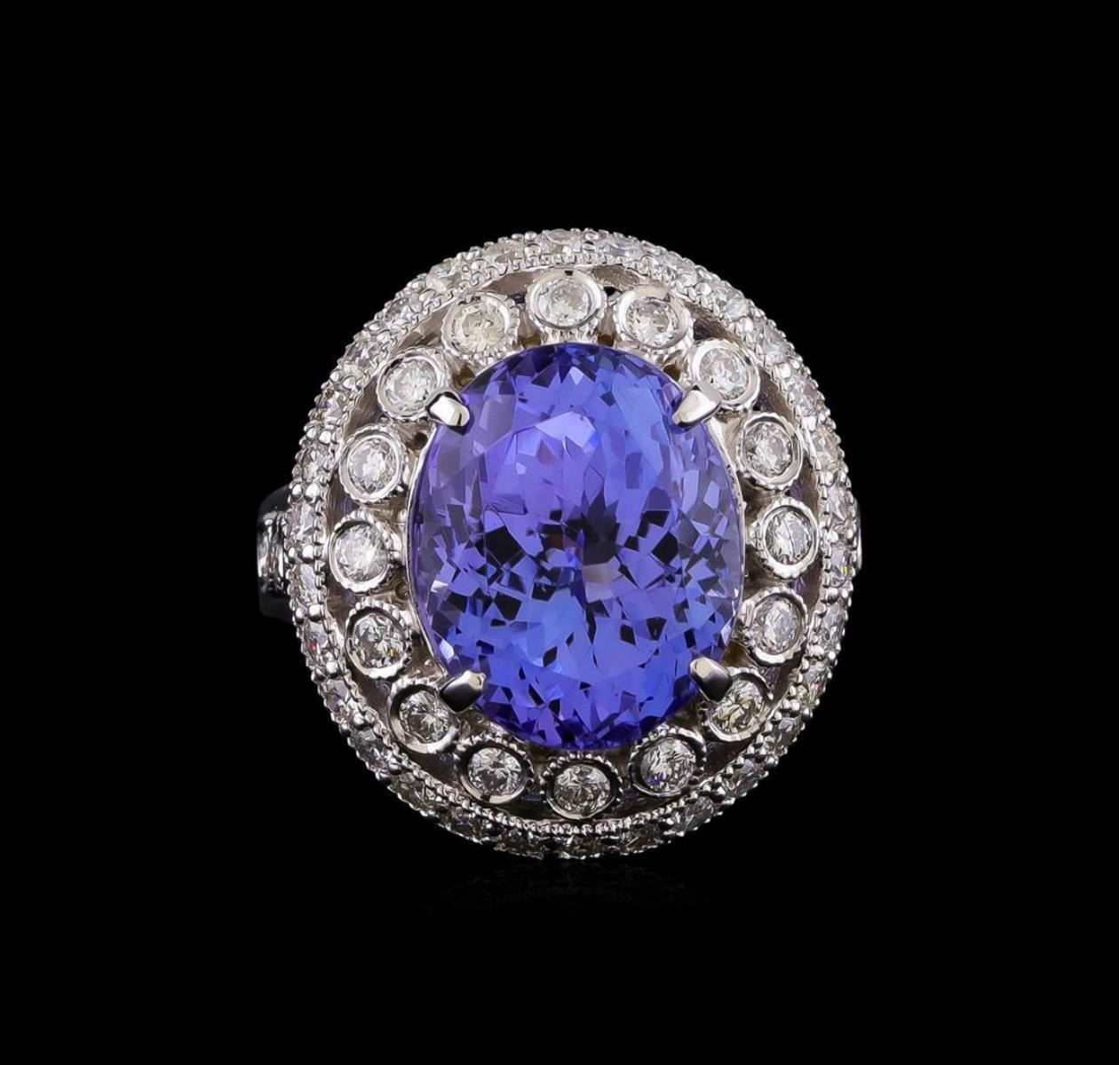 One electronically tested 14KT white gold lady's cast fashion ring with a double basket halo with a bright polish with milgrain detailing finish. The featured lady's has a shank measuring 3.11 millimeters in width. Identified with markings of "K14". Condition is new, good workmanship. Containing: One prong set oval modified brilliant cut natural tanzanite, measuring 13.15 x 10.74 x 9.02mm, (depth est.) approximate weight of 9.23ct., clarity is eye clean, medium light, moderately strong, violetish blue color, (GIA vB 4/4), cut is very good. Transmitting light with no distortion, transparent. Colored gemstones are presumed to have been subjected to commonly used enhancement processes. Graded in the setting. Twenty-Two bezel set round brilliant cut diamonds, measuring 1.95 - 1.90 x 1.20mm (depth est.) approximate total weight of 22 Stones = 0.60ct. Graded in the setting. Clarity: SI-1 to I-1. Color: H - I. Cut Good Thirty prong set round brilliant cut diamonds, measuring 1.85 - 1.75 x 1.12mm (depth est.) approximate total weight of 30 Stones = 0.67ct. Graded in the setting. Clarity: SI-1 to SI-2. Color: H - I. Cut Good. Total Weight of Colored Stones 9.23ct. Total Weight of Diamonds 1.27ct. Total Weight of Ring 9.60gm. GAS Appraised.
