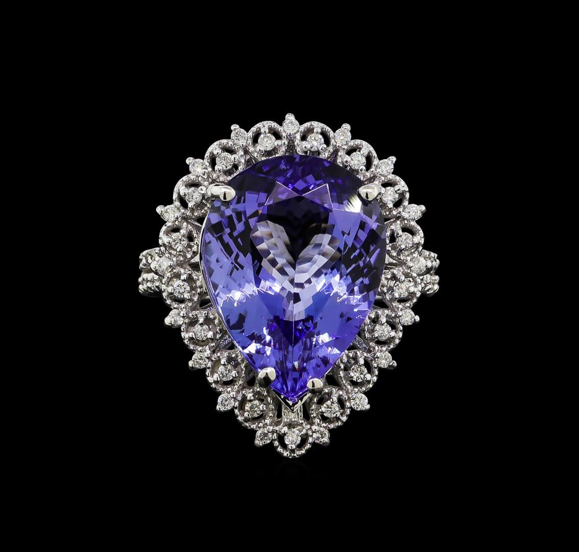 One electronically tested 14KT white gold lady's cast fashion ring with a split shank scalloped basket halo with a bright polish with milgrain detailing finish. The featured lady's ring has a shank measuring 2.89 millimeters wide. Identified with markings of 'K14'. Condition is new, good workmanship. Containing: One prong set pear modified brilliant cut natural tanzanite, measuring 16.26 x 12.25 x 6.99mm, (depth est.) approximate weight of 9.24ct., clarity is eye clean, medium, moderately strong, bluish violet color, (GIA bV 5/4), cut is very good. Transmitting light with no distortion, transparent. Colored gemstones are presumed to have been subjected to commonly used enhancement processes. Graded in the setting. Seventeen prong set round brilliant cut diamonds, measuring 1.40 - 1.30 x 0.84mm (depth est.) approximate total weight of 17 Stones = 0.16ct. Graded in the setting. Clarity SI-1 to I-1. Color: H - I Cut Good Forty-One prong set round brilliant cut diamonds, measuring 1.20 - 1.10 x 0.71mm (depth est.) approximate total weight of 41 Stones = 0.24ct. Graded in the setting. Clarity SI-1 to I-1. Color: H - I Cut Good. Total Weight of Colored Stones 9.24ct.. Total Weight of Diamonds 0.40ct.. Total Weight of Ring 7.40gm GAS Appraised at $16,595.00.