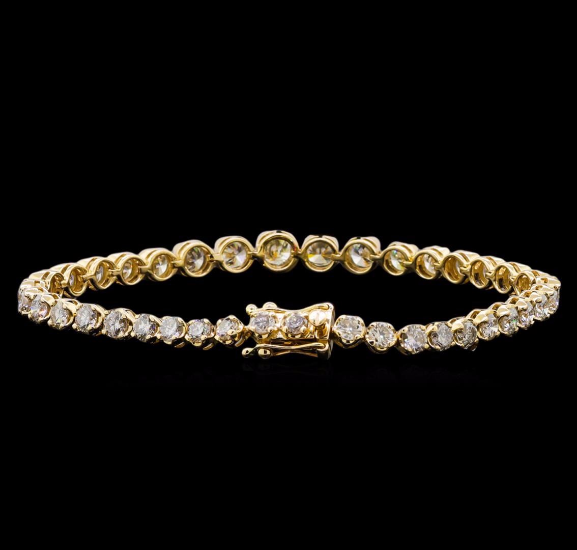 One electronically tested 14KT yellow gold ladies cast & assembled diamond tennis bracelet. Seven and one-half inch length bracelet composed of a flexible graduating ribbon of diamonds, terminating in a concealed clasp with twin safeties. Identified with markings of "14K". Trademark is "Orianne". Condition is new, good workmanship. Tennis bracelets & necklaces got their unusual name from an incident involving the U.S. professional tennis player Chris Evert during a tennis match in the 1980's. Evert had been wearing an expensive diamond bracelet, an inline string of individually-set diamonds. Previously these bracelets were known as eternity bracelets. When the clasp snapped during play, she asked the officials to stop the tennis match until the bracelet could be found. Since that day, bracelets and necklaces featuring an inline string of diamonds have been called tennis bracelets and tennis necklaces. Containing: Nine prong set round brilliant cut diamonds, measuring 4.90 - 4.40 x 2.79mm (depth est.) approximate total weight of 9 Stones = 3.41ct. Graded in the setting. Clarity: SI-1 to I-1. Color: I - K Eighteen prong set round brilliant cut diamonds, measuring 4.20 - 3.70 x 2.37mm (depth est.) approximate total weight of 18 Stones = 4.16ct. Graded in the setting. Clarity: SI-2 to I-1. Color: I - K Twelve prong set round brilliant cut diamonds, measuring 3.50 - 3.10 x 1.98mm (depth est.) approximate total weight of 12 Stones = 1.68ct. Graded in the setting. Clarity: SI-2 to I-2. Color: I - K. Total Weight of Diamonds 9.25ct. Total Weight of Tennis Bracelet 12.49gm. AIG Appraised at $34,990.00.