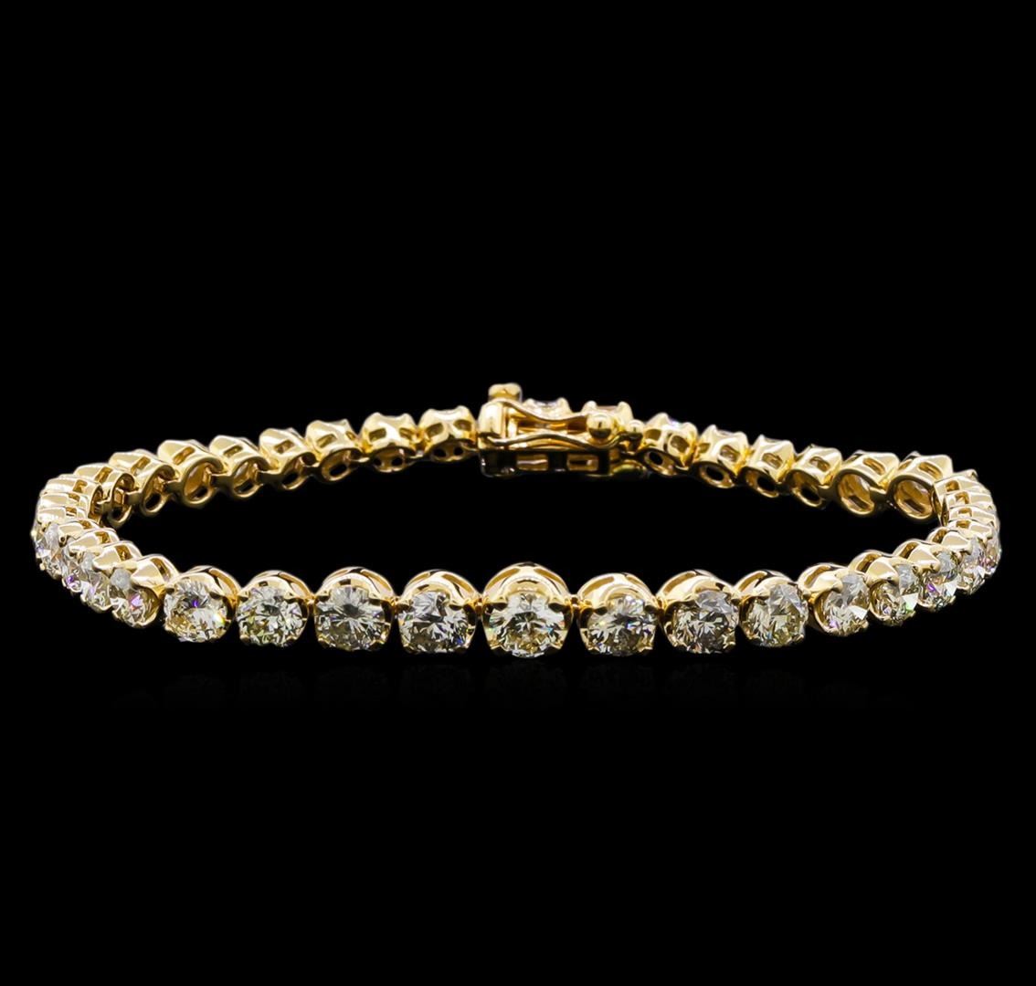 One electronically tested 14KT yellow gold ladies cast & assembled diamond tennis bracelet. Seven and one-half inch length bracelet composed of a flexible graduating ribbon of diamonds, terminating in a concealed clasp with twin safeties. Identified with markings of "14K". Trademark is "Orianne". Condition is new, good workmanship. Tennis bracelets & necklaces got their unusual name from an incident involving the U.S. professional tennis player Chris Evert during a tennis match in the 1980's. Evert had been wearing an expensive diamond bracelet, an inline string of individually-set diamonds. Previously these bracelets were known as eternity bracelets. When the clasp snapped during play, she asked the officials to stop the tennis match until the bracelet could be found. Since that day, bracelets and necklaces featuring an inline string of diamonds have been called tennis bracelets and tennis necklaces. Containing: Nine prong set round brilliant cut diamonds, measuring 4.90 - 4.40 x 2.79mm (depth est.) approximate total weight of 9 Stones = 3.41ct. Graded in the setting. Clarity: SI-1 to I-1. Color: I - K Eighteen prong set round brilliant cut diamonds, measuring 4.20 - 3.70 x 2.37mm (depth est.) approximate total weight of 18 Stones = 4.16ct. Graded in the setting. Clarity: SI-2 to I-1. Color: I - K Twelve prong set round brilliant cut diamonds, measuring 3.50 - 3.10 x 1.98mm (depth est.) approximate total weight of 12 Stones = 1.68ct. Graded in the setting. Clarity: SI-2 to I-2. Color: I - K. Total Weight of Diamonds 9.25ct. Total Weight of Tennis Bracelet 12.49gm. AIG Appraised at $34,990.00.