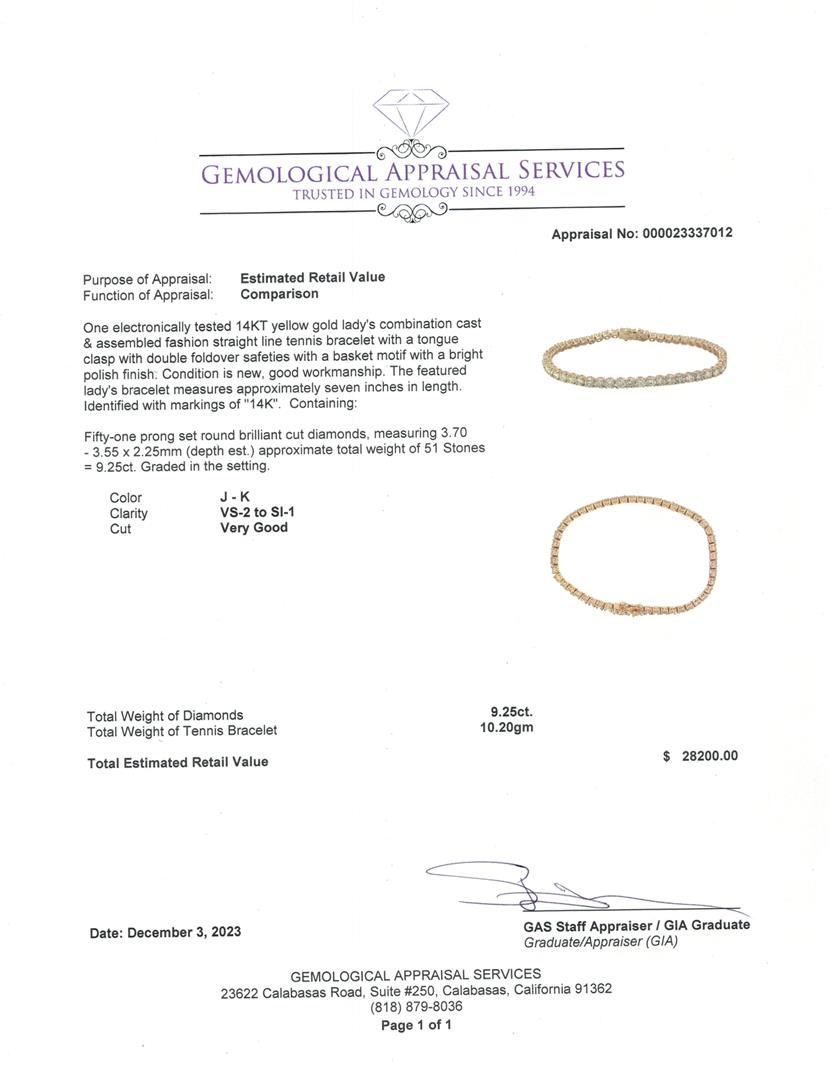 One new 9.25 ctw Diamond Tennis Bracelet - 14KT Yellow Gold. Appraisal Value: $28200. See appraisal for full details.