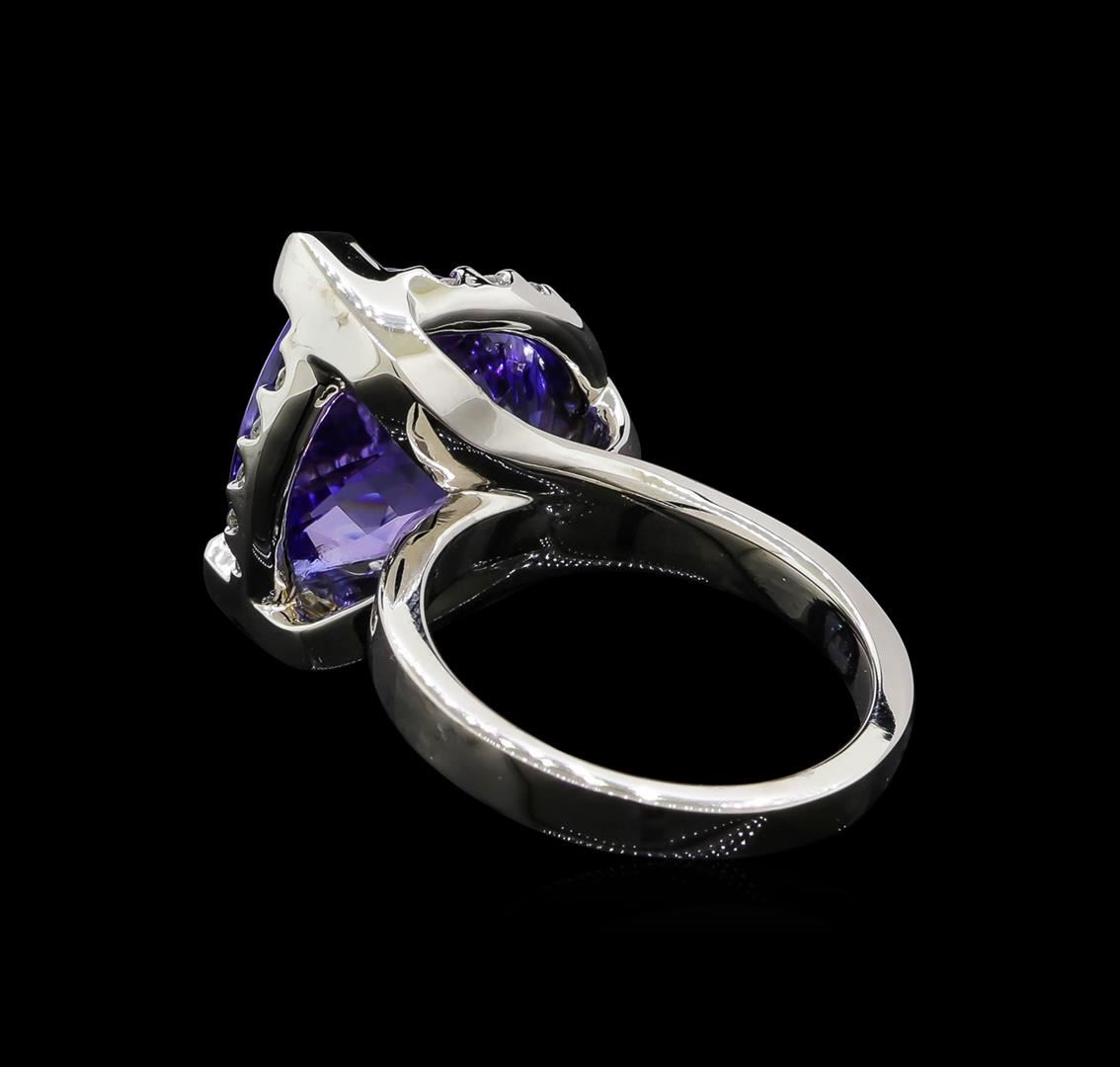 One electronically tested 14KT white gold lady's cast fashion ring with a cathedral halo with a bright polish finish. The featured lady's ring has a shank measuring 2.70 millimeters wide. Identified with markings of '14K'. Condition is new, good workmanship. Containing: One prong set triangle modified brilliant cut natural tanzanite, measuring 13.00 x 13.60 x 8.84mm, (depth est.) approximate weight of 9.25ct., clarity is eye clean, medium dark, moderately strong, violetish blue color, (GIA vB 6/4), cut is very good. Transmitting light with no distortion, transparent. Colored gemstones are presumed to have been subjected to commonly used enhancement processes. Graded in the setting. Fifteen prong set round brilliant cut diamonds, measuring 1.80 - 1.70 x 1.09mm (depth est.) approximate total weight of 15 Stones = 0.30ct. Graded in the setting. Clarity SI-1 to SI-2. Color: H - I Cut Good. Total Weight of Colored Stones 9.25ct.. Total Weight of Diamonds 0.30ct.. Total Weight of Ring 9.00gm GAS Appraised at $15,310.00.