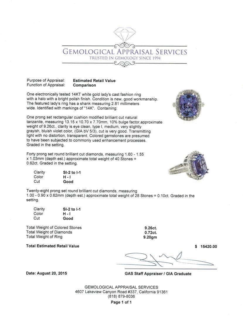 One electronically tested 14KT white gold lady's cast fashion ring with a halo with a bright polish finish. The featured lady's ring has a shank measuring 2.81 millimeters wide. Identified with markings of "14K". Condition is new, good workmanship. Containing: One prong set rectangular cushion modified brilliant cut natural tanzanite, measuring 13.15 x 10.70 x 7.70mm, 10% bulge factor, approximate weight of 9.26ct., clarity is eye clean, type I, medium, very slightly grayish, bluish violet color, (GIA bV 5/3), cut is very good. Transmitting light with no distortion, transparent. Colored gemstones are presumed to have been subjected to commonly used enhancement processes. Graded in the setting. Forty prong set round brilliant cut diamonds, measuring 1.60 - 1.55 x 1.03mm (depth est.) approximate total weight of 40 Stones = 0.62ct. Graded in the setting. Clarity: SI-2 to I-1. Color: H - I. Cut Good Twenty-Eight prong set round brilliant cut diamonds, measuring 1.00 - 0.90 x 0.62mm (depth est.) approximate total weight of 28 Stones = 0.10ct. Graded in the setting. Clarity: SI-2 to I-1. Color: H - I. Cut Good. Total Weight of Colored Stones 9.26ct. Total Weight of Diamonds 0.72ct. Total Weight of Ring 9.20gm. GAS Appraised at $15,420.00.