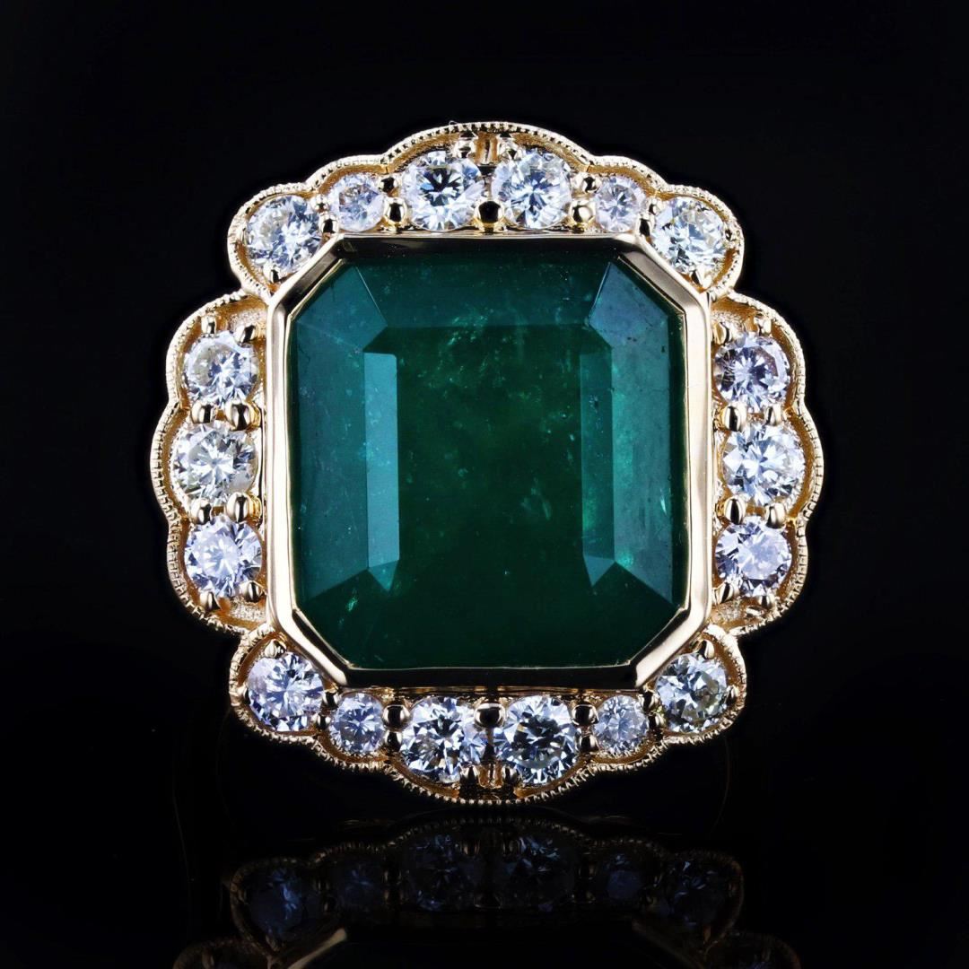 Eighteen karat (18K) yellow gold natural emerald beryl and diamond ring. An octagonal step cut natural emerald beryl gemstone is mounted in the center of the ring. Round brilliant cut diamonds accent the ring around the center gemstone. The ring has a gross weight of 9.7 Grams. Reference: GIA Emerald Report #6223229561 *NATURAL GEMSTONE* GEMSTONE: Emerald Beryl NATURE: Natural SHAPE: Octagonal Step, Faceted Cut WEIGHT: 9.27 carat total DIMENSIONS: 13.30 x 12.77 x 6.80mm CLARITY: Type 3 COLOR: Green (5/5) SYMMETRY: Excellent COLOR INTENSITY: Intense TRANSPARENCY: Transparent-Semi-Transparent TONE: Dark *NATURAL DIAMOND* SHAPE: Round Brilliant Cut WEIGHT: 1.25 carat total (18pcs.) DIMENSIONS: 2.7 x 1.6mm AVERAGE CIARITY: SI1-SI2 AVERAGE COLOR: G-H SYMMETRY: Excellent POLISH: Excellent *METAL* METAL: Gold PURITY: 18K (750) COLOR: Yellow CONDITION: Excellent FINISH: High Polish