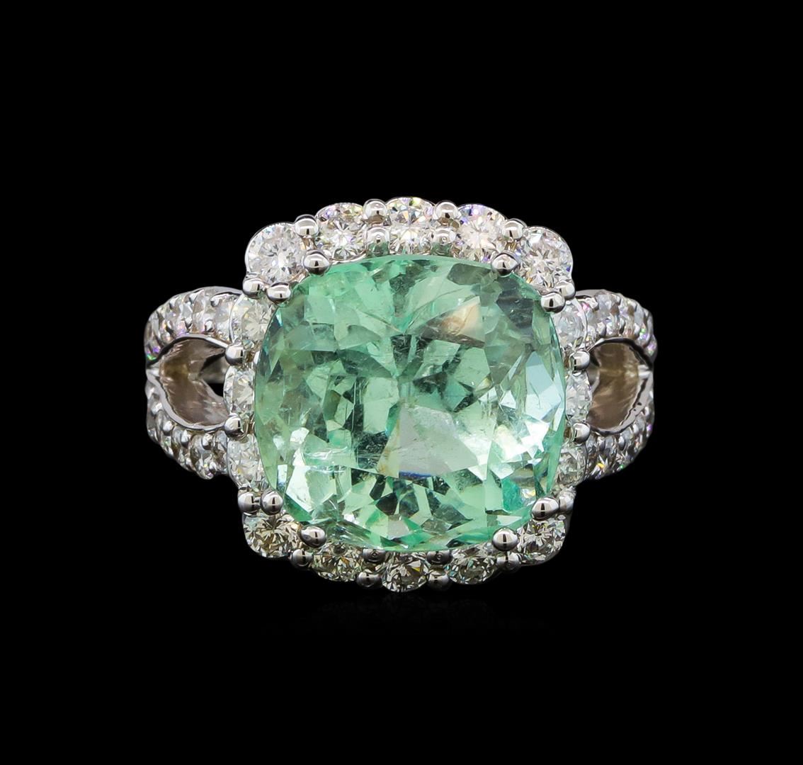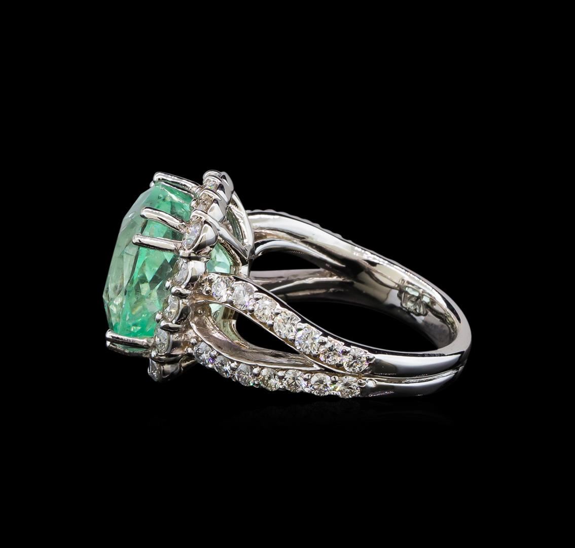 One electronically tested 14KT white gold lady's cast fashion ring with a double split shank basket halo with a bright polish finish. The featured lady's ring has a double shank measuring 3.74 millimeters wide. Identified with markings of '14K'. Condition is new, good workmanship. Containing: One prong set square cushion modified brilliant cut natural emerald, measuring 12.63 x 12.13 x 10.15mm, (depth est.) approximate weight of 9.35ct., clarity is moderately included, light, moderately strong, green color, (GIA G 3/4), cut is very good. Transmitting light somewhat diffusely, transparent to translucent. Naturally occurring internal & external characteristics are present. Indications of oil residue. Colored gemstones are presumed to have been subjected to commonly used enhancement processes. Graded in the setting. Sixteen prong set round brilliant cut diamonds, measuring 2.50 - 2.40 x 1.52mm (depth est.) approximate total weight of 16 Stones = 0.90ct. Graded in the setting. Clarity SI-1 to I-1. Color: G - H Cut Good Twenty-Eight prong set round brilliant cut diamonds, measuring 2.00 - 1.90 x 1.21mm (depth est.) approximate total weight of 28 Stones = 0.78ct. Graded in the setting. Clarity SI-1 to I-1. Color: G - H Cut Good. Total Weight of Colored Stones 9.35ct.. Total Weight of Diamonds 1.68ct.. Total Weight of Ring 10.00gm. GAS Appraised at $16,485.00.