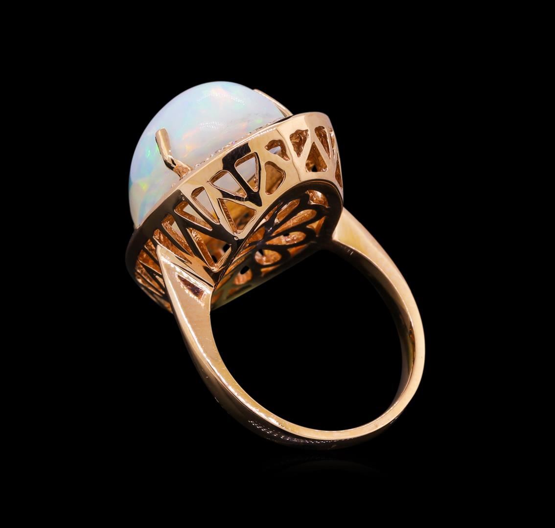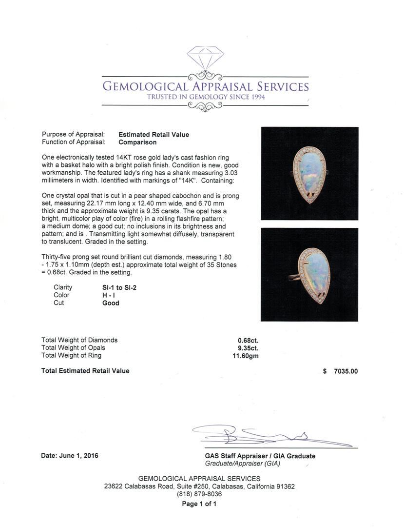 One electronically tested 14KT rose gold lady's cast fashion ring with a basket halo with a bright polish finish. The featured lady's ring has a shank measuring 3.03 millimeters in width. Identified with markings of "14K". Condition is new, good workmanship. Containing: One crystal opal that is cut in a pear shaped cabochon and is prong set, measuring 22.17 mm long x 12.40 mm wide, and 6.70 mm thick and the approximate weight is 9.35 carats. The opal has a bright, multicolor play of color (fire) in a rolling flashfire pattern; a medium dome; a good cut; no inclusions in its brightness and pattern; and is. Transmitting light somewhat diffusely, transparent to translucent. Graded in the setting. Thirty-Five prong set round brilliant cut diamonds, measuring 1.80 - 1.75 x 1.10mm (depth est.) approximate total weight of 35 Stones = 0.68ct. Graded in the setting. Clarity: SI-1 to SI-2. Color: H - I. Cut Good. Total Weight of Diamonds 0.68ct. Total Weight of Opals 9.35ct. Total Weight of Ring 11.60gm. GAS Appraised at $7,035.00.
