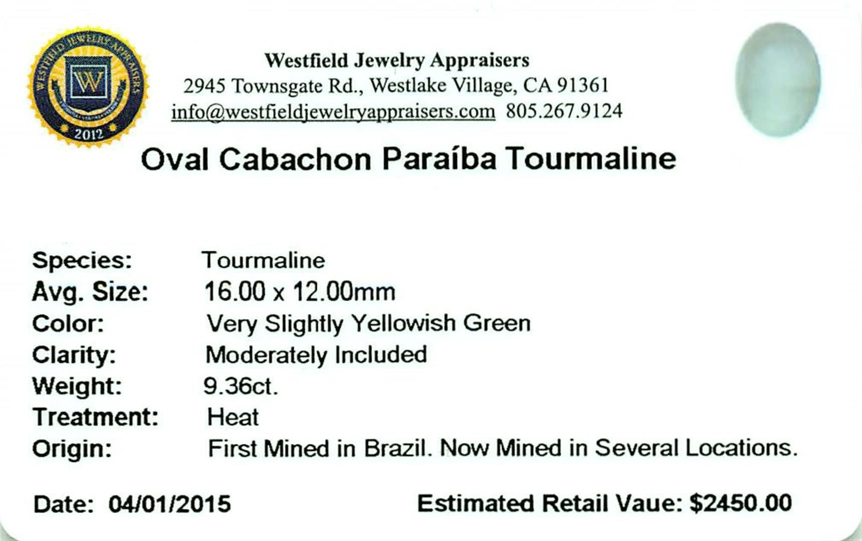 One oval cabochon cut natural Paraiba tourmaline exact weight 9.36ct., clarity is moderately included, cut is good. Westfield Appraised at $2,450.00.