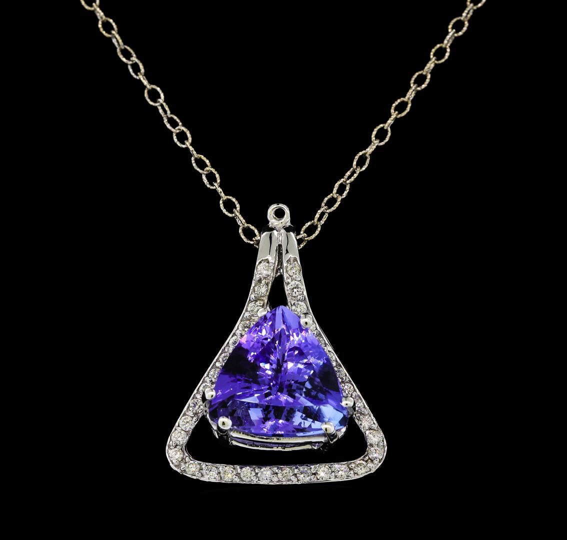 One electronically tested 14KT white gold lady's combination cast & assembled fashion pendant & chain 18.0' long, 1.8mm twisted oval shape link with a lobster claw clasp with a bright polish finish. Identified with markings of '14K 585'. Condition is new, good workmanship. Containing: One prong set triangle modified brilliant cut natural tanzanite, measuring 14.00 x 13.55 x 9.50mm, (depth est.) approximate weight of 9.36ct., clarity is eye clean, medium, moderately strong, bluish violet color, (GIA bV 5/4), cut is very good. Transmitting light with no distortion, transparent. Colored gemstones are presumed to have been subjected to commonly used enhancement processes. Graded in the setting. Thirty-Four prong set round brilliant cut diamonds, measuring 1.60 - 1.50 x 0.93mm (depth est.) approximate total weight of 34 Stones = 0.46ct. Graded in the setting. Clarity SI-1 to SI-2. Color: H - I Cut Good. Total Weight of Colored Stones 9.36ct.. Total Weight of Diamonds 0.46ct.. Total Weight of Pendant & Chain 7.40gm. GAS Appraised at $14,245.00.