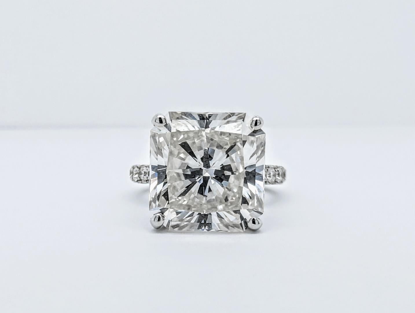 This ring features an incredible 7.71ct radiant cut diamond with VVS-2 clarity and H color. Excellent craftsmanship and EGL certified! One electronically tested 18KT white gold lady's combination cast & assembled hidden halo wedding ring with a solitaire motif with a bright polish finish. Condition is new, good workmanship. The featured lady's ring has a shank with diamonds on top and sides, with a shank measuring 2.35 millimeters in width. Identified with markings of 18K. Containing: One prong set radiant shaped cut diamond, measuring 11.64 x 11.38 x 7.44mm (depth est.) approximate weight of 7.71ct. EGL USA Laboratory Report # US 92611540D. Color: H Clarity: VVS-2 Cut: Very Good Seventy-nine prong set round brilliant cut diamonds, measuring 1.70 - 1.50 x 0.99mm (depth est.) approximate total weight of 79 Stones = 1.38ct. Graded in the setting. Color: G-H Clarity: VS-1 to VS-2 Cut: Excellent Forty-eight prong set round brilliant cut diamonds, measuring 1.20 - 1.10 x 0.69mm (depth est.) approximate total weight of 48 Stones = 0.28ct. Graded in the setting. Color: G-H Clarity: VS-1 to VS-2 Cut: Very Good Total Weight of Diamonds: 9.37ct. Total Weight of Wedding Ring: 4.80gm Total Estimated Retail Value: $420,000.00 Appraisal No: 000024226000