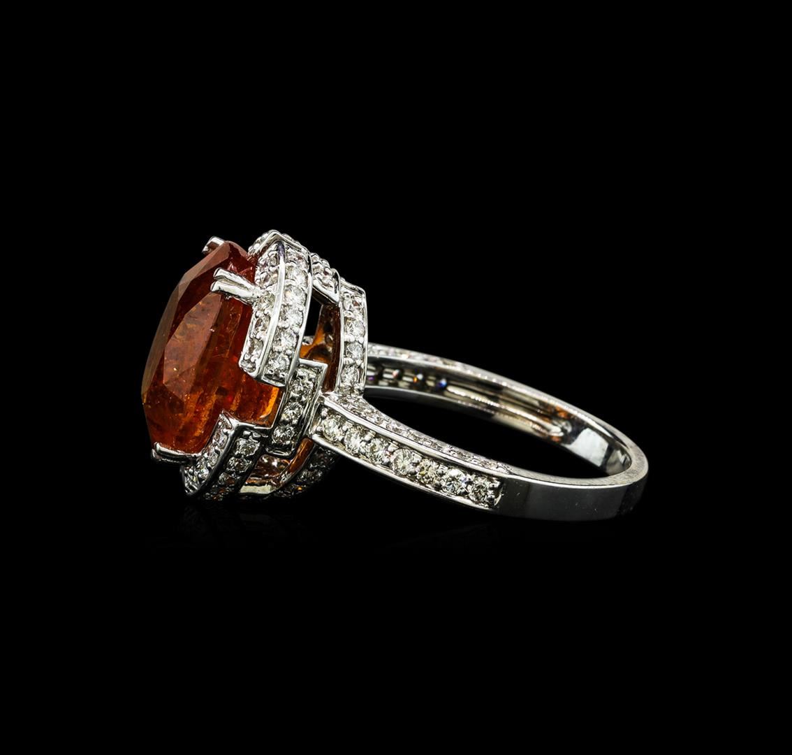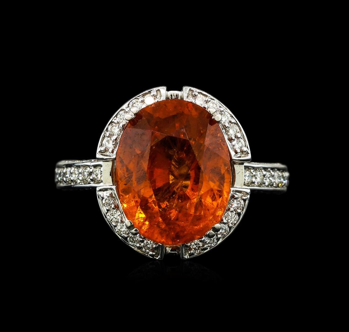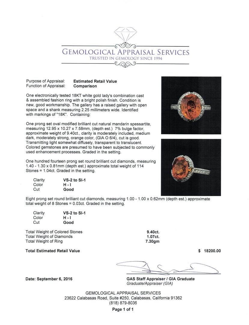 One electronically tested 18KT white gold lady's combination cast & assembled fashion ring with a bright polish finish. The gallery has a raised gallery with open space and a shank measuring 2.25 millimeters wide. Identified with markings of '18K'. Condition is new, good workmanship. Containing: One prong set oval modified brilliant cut natural mandarin spessartite, measuring 12.95 x 10.27 x 7.58mm, (depth est.) 7%. bulge factor, approximate weight of 9.40ct., clarity is moderately included, medium dark, moderately strong, orange color, (GIA O 6/4), cut is good. Transmitting light somewhat diffusely, transparent to translucent. Colored gemstones are presumed to have been subjected to commonly used enhancement processes. Graded in the setting. One Hundred Fourteen prong set round brilliant cut diamonds, measuring 1.40 - 1.30 x 0.81mm (depth est.) approximate total weight of 114 Stones = 1.04ct. Graded in the setting. Clarity VS-2 to SI-1. Color: H - I Cut Good Eight prong set round brilliant cut diamonds, measuring 1.00 - 1.00 x 0.62mm (depth est.) approximate total weight of 8 Stones = 0.03ct. Graded in the setting. Clarity VS-2 to SI-1. Color: H - I Cut Good. Total Weight of Colored Stones 9.40ct.. Total Weight of Diamonds 1.07ct.. Total Weight of Ring 7.30gm GAS Appraised at $18,200.00.