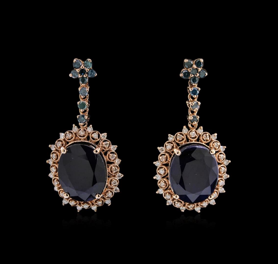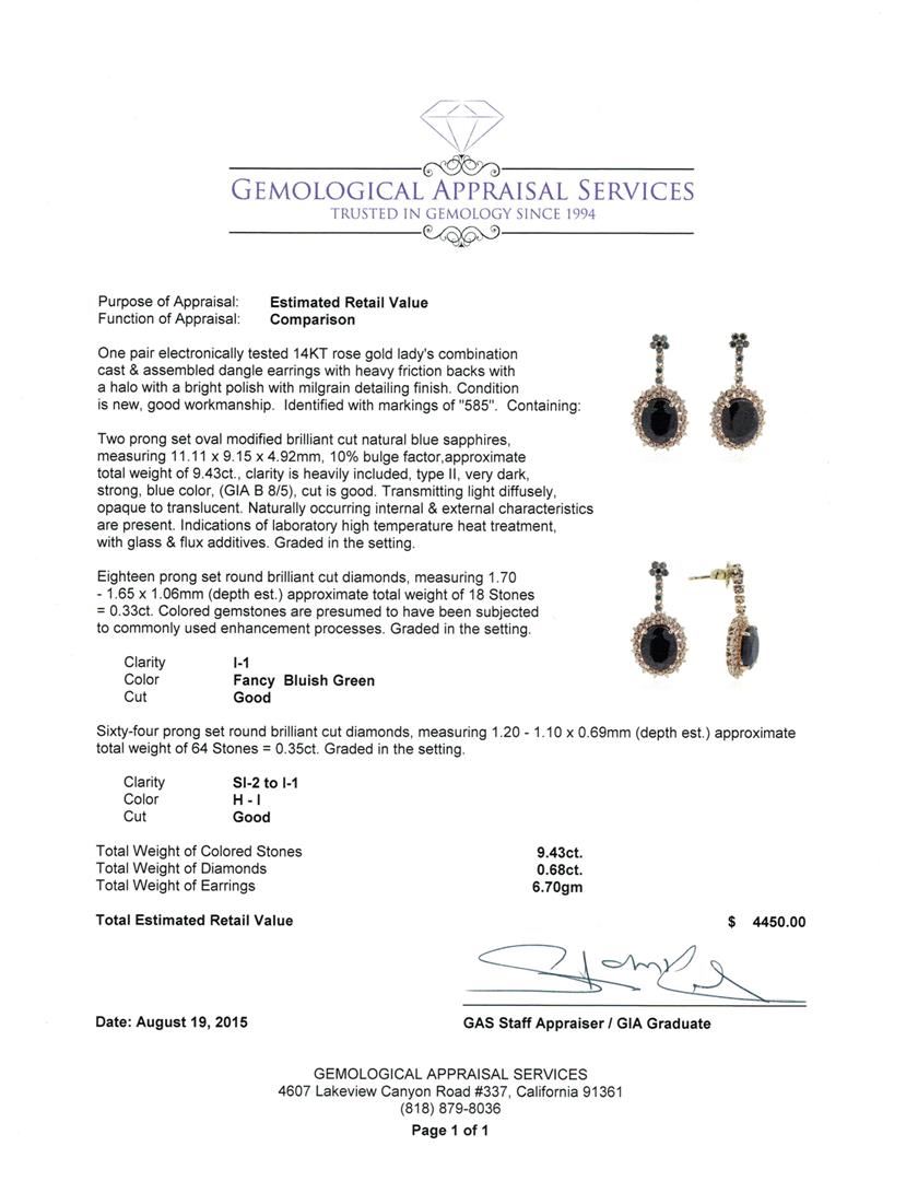 One pair electronically tested 14KT rose gold lady's combination cast & assembled dangle earrings with heavy friction backs with a halo with a bright polish with milgrain detailing finish. Identified with markings of "585". Condition is new, good workmanship. Containing: Two prong set oval modified brilliant cut natural blue sapphires, measuring 11.11 x 9.15 x 4.92mm, 10% bulge factor, approximate total weight of 9.43ct., clarity is heavily included, type II, very dark, strong, blue color, (GIA B 8/5), cut is good. Transmitting light diffusely, opaque to translucent. Naturally occurring internal & external characteristics are present. Indications of laboratory high temperature heat treatment, with glass & flux additives. Graded in the setting. Eighteen prong set round brilliant cut diamonds, measuring 1.70 - 1.65 x 1.06mm (depth est.) approximate total weight of 18 Stones = 0.33ct. Colored gemstones are presumed to have been subjected to commonly used enhancement processes. Graded in the setting. Clarity: I-1 Cut Good Sixty-Four prong set round brilliant cut diamonds, measuring 1.20 - 1.10 x 0.69mm (depth est.) approximate total weight of 64 Stones = 0.35ct. Graded in the setting. Clarity: SI-2 to I-1. Color: H - I. Cut Good. Total Weight of Colored Stones 9.43ct. Total Weight of Diamonds 0.68ct. Total Weight of Earrings 6.70gm. GAS Appraised at $4,450.00.