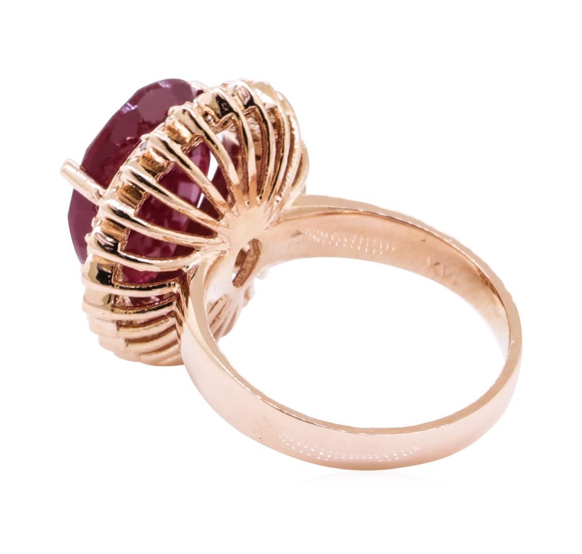 One electronically tested 14KT rose gold lady's cast fashion ring with a basket halo with a bright polish finish. The featured lady's ring has a shank measuring 2.85 millimeters wide. Identified with markings of 'K14'. Condition is new, good workmanship. Containing: One prong set pear modified mixed cut natural ruby-glass composite, measuring 15.77 x 11.38 x 5.40mm, (depth est.) 15%. bulge factor, approximate weight of 8.92ct., clarity is heavily included, medium dark, moderately strong, strongly purplish red color, (GIA stpR 6/4), cut is good. Transmitting light somewhat diffusely, semi-transparent to translucent. Naturally occurring internal & external characteristics are present. Indications of laboratory high temperature heat treatment, with glass & flux additives. Colored gemstones are presumed to have been subjected to commonly used enhancement processes. Graded in the setting. Twenty-Three prong set round brilliant cut diamonds, measuring 1.90 - 1.80 x 1.11mm (depth est.) approximate total weight of 23 Stones = 0.52ct. Graded in the setting. Color H - I Clarity SI-2 to I-1 Cut Good. Total Weight of Colored Stones 8.92ct.. Total Weight of Diamonds 0.52ct.. Total Weight of Ring 8.90gm GAS Appraised at $3595.00. GAS Appraised.