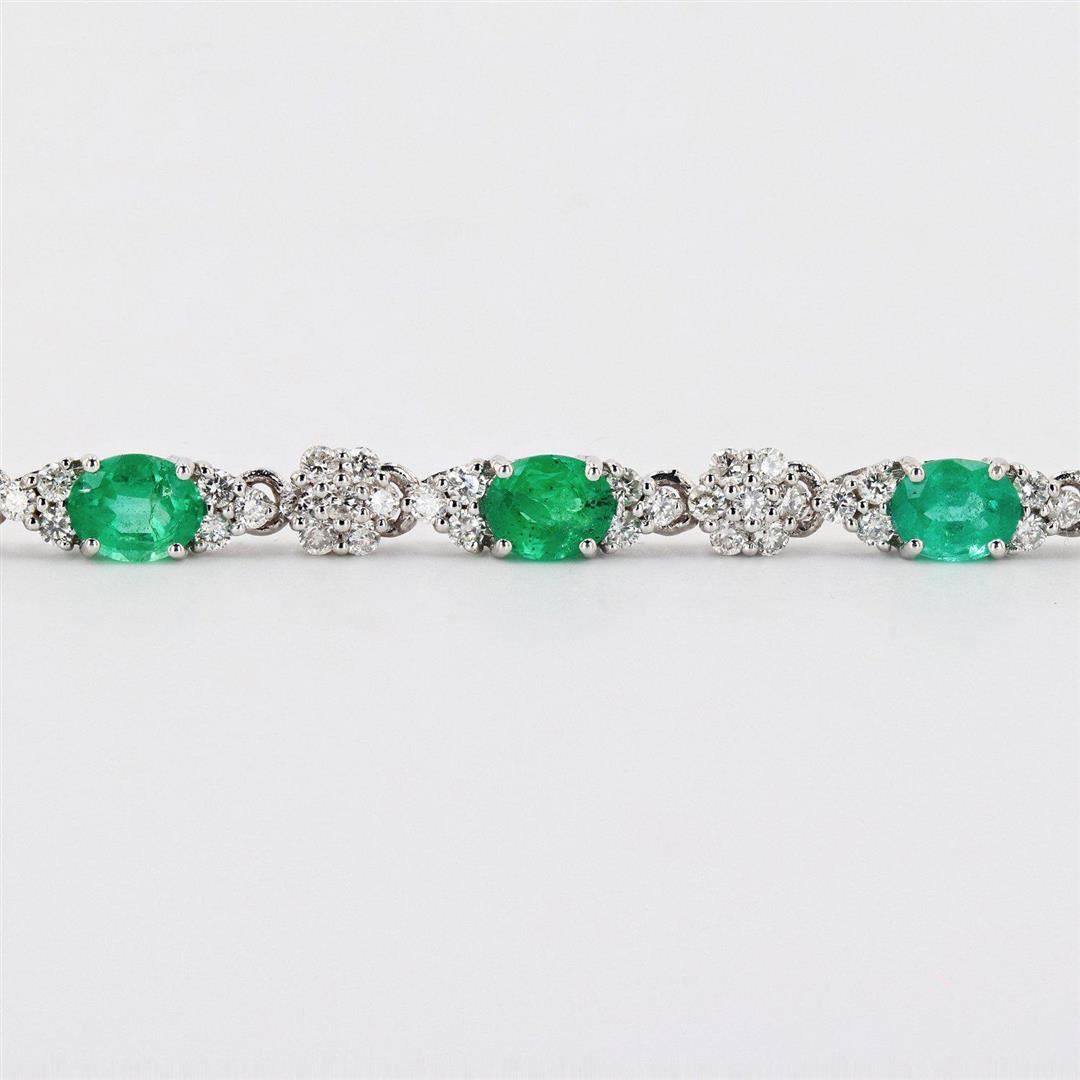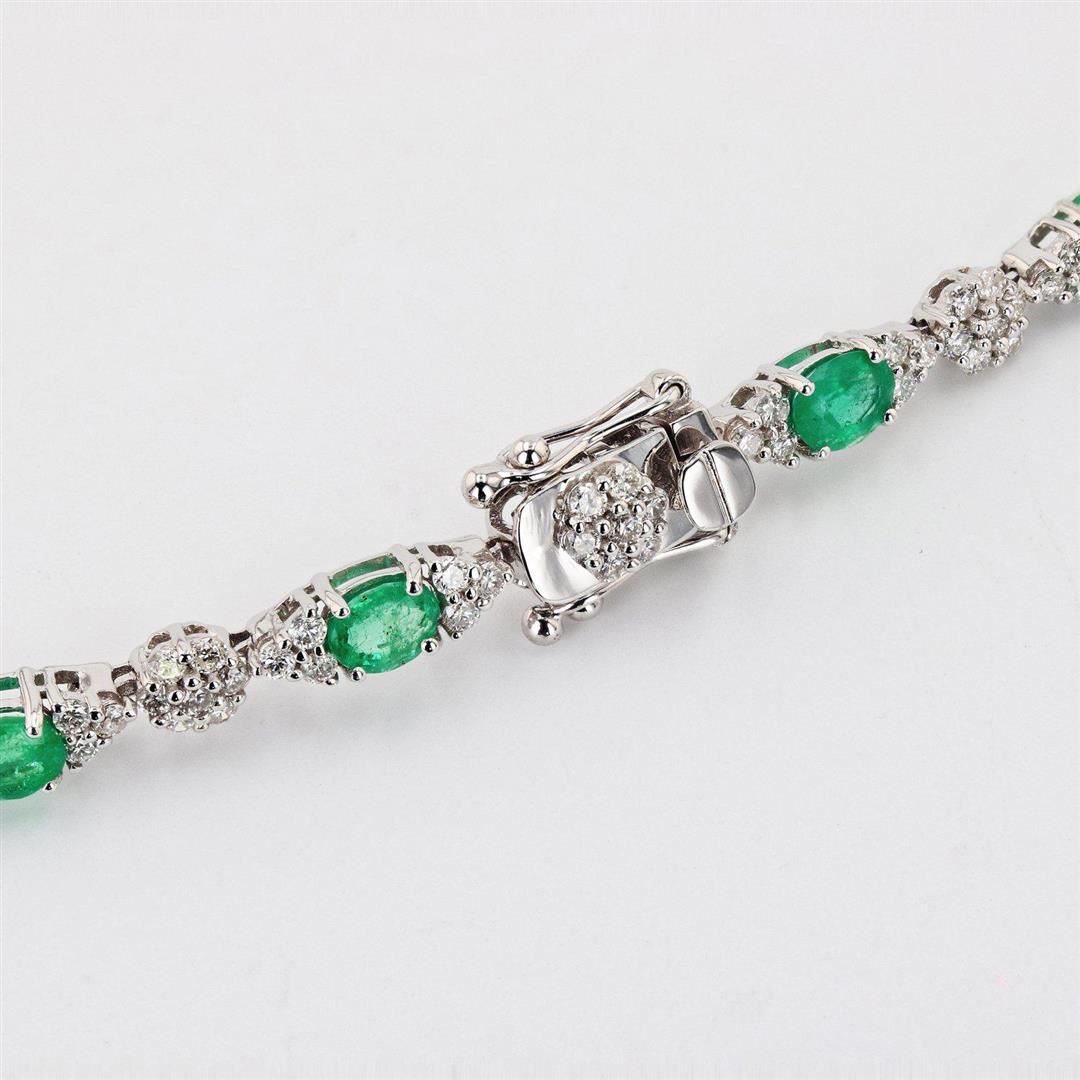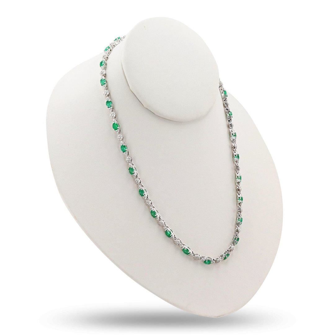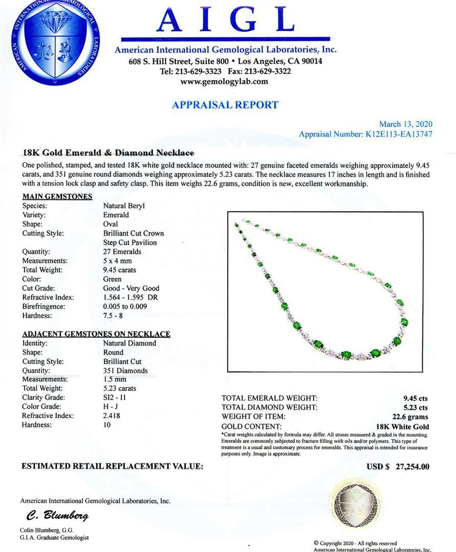One polished, stamped, and tested 18K white gold necklace mounted with: 27 genuine faceted emeralds weighing approximately 9.45 carats, and 351 genuine round diamonds weighing approximately 5.23 carats. The necklace measures 17 inches in length and is finished with a tension lock clasp and safety clasp. This item weighs 22.6 grams, condition is new, excellent workmanship. MAIN GEMSTONES Species: Natural Beryl Variety: Emerald Shape: Oval Cutting Style: Brilliant Cut Crown Step Cut Pavilion Quantity: 27 Emeralds Measurements: 5mm x 4 mm Total Weight: 9.45 carats Color: Green Cut Grade: Good - Very Good Refractive Index: 1.564 - 1.595 DR Birefringence: 0.005 to 0.009 Hardness: 7.5 - 8 ADJACENT GEMSTONES ON NECKLACE Identity: Natural Diamond Shape: Round Cutting Style: Brilliant Cut Quantity: 351 Diamonds Measurements: 1.5mm Total Weight: 5.23 carats Clarity Grade: SI2 to I1 Color Grade: H - J Refractive Index: 2.418 Hardness: 10 TOTAL EMERALD WEIGHT: 9.45 cts TOTAL DIAMOND WEIGHT: 5.23 cts WEIGHT OF ITEM: 22.6 grams GOLD CONTENT: 18K White Gold