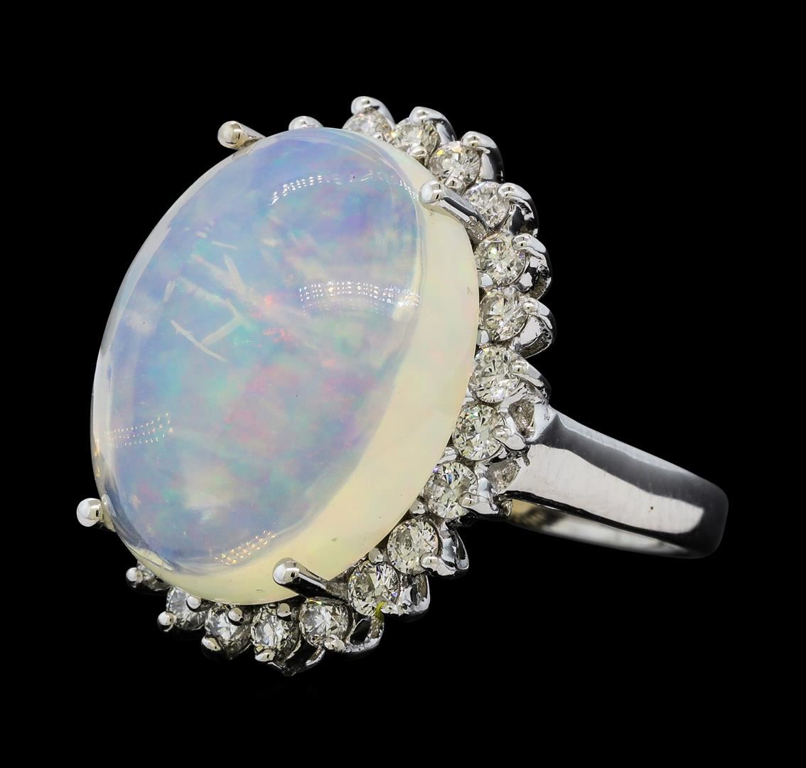 One electronically tested 14KT white gold lady's cast fashion ring with a basket halo with a bright polish finish. The featured lady's ring has a shank measuring 2.74 millimeters wide. Identified with markings of '14K'. Condition is new, good workmanship. Containing: One crystal opal that is cut in a oval shaped cabochon and is prong set, measuring 18.46 mm long x 15.70 mm wide, and 7.04 mm thick and the approximate weight is 9.45 carats. The opal has a somewhat bright, multicolor play of color (fire) in a rolling flashfire pattern; a medium dome; a good cut; no inclusions; consistent in its brightness and pattern; and is slightly directional. Graded in the setting. Twenty-Four prong set round brilliant cut diamonds, measuring 2.20 - 2.10 x 1.31mm (depth est.) approximate total weight of 24 Stones = 0.88ct. Graded in the setting. Clarity SI-1 to I-1. Color: G - H Cut Good. Total Weight of Diamonds 0.88ct.. Total Weight of Opals 9.45ct.. Total Weight of Ring 8.20gm. GAS Appraised at $4,770.00.