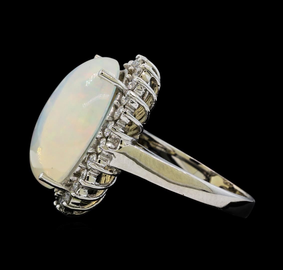 One electronically tested 14KT white gold lady's cast fashion ring with a basket halo with a bright polish finish. The featured lady's ring has a shank measuring 2.74 millimeters wide. Identified with markings of '14K'. Condition is new, good workmanship. Containing: One crystal opal that is cut in a oval shaped cabochon and is prong set, measuring 18.46 mm long x 15.70 mm wide, and 7.04 mm thick and the approximate weight is 9.45 carats. The opal has a somewhat bright, multicolor play of color (fire) in a rolling flashfire pattern; a medium dome; a good cut; no inclusions; consistent in its brightness and pattern; and is slightly directional. Graded in the setting. Twenty-Four prong set round brilliant cut diamonds, measuring 2.20 - 2.10 x 1.31mm (depth est.) approximate total weight of 24 Stones = 0.88ct. Graded in the setting. Clarity SI-1 to I-1. Color: G - H Cut Good. Total Weight of Diamonds 0.88ct.. Total Weight of Opals 9.45ct.. Total Weight of Ring 8.20gm. GAS Appraised at $4,770.00.