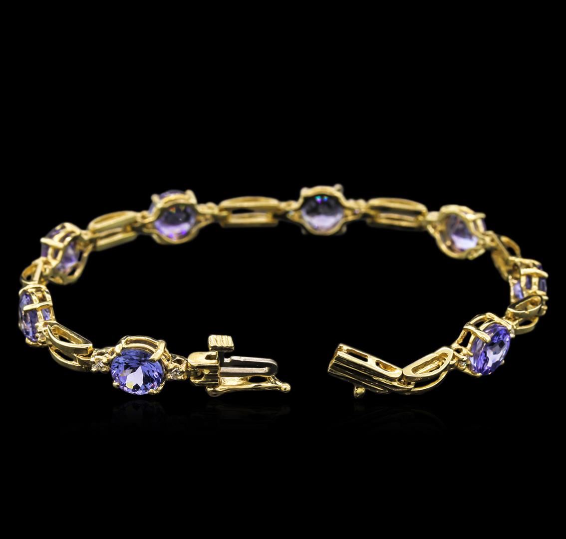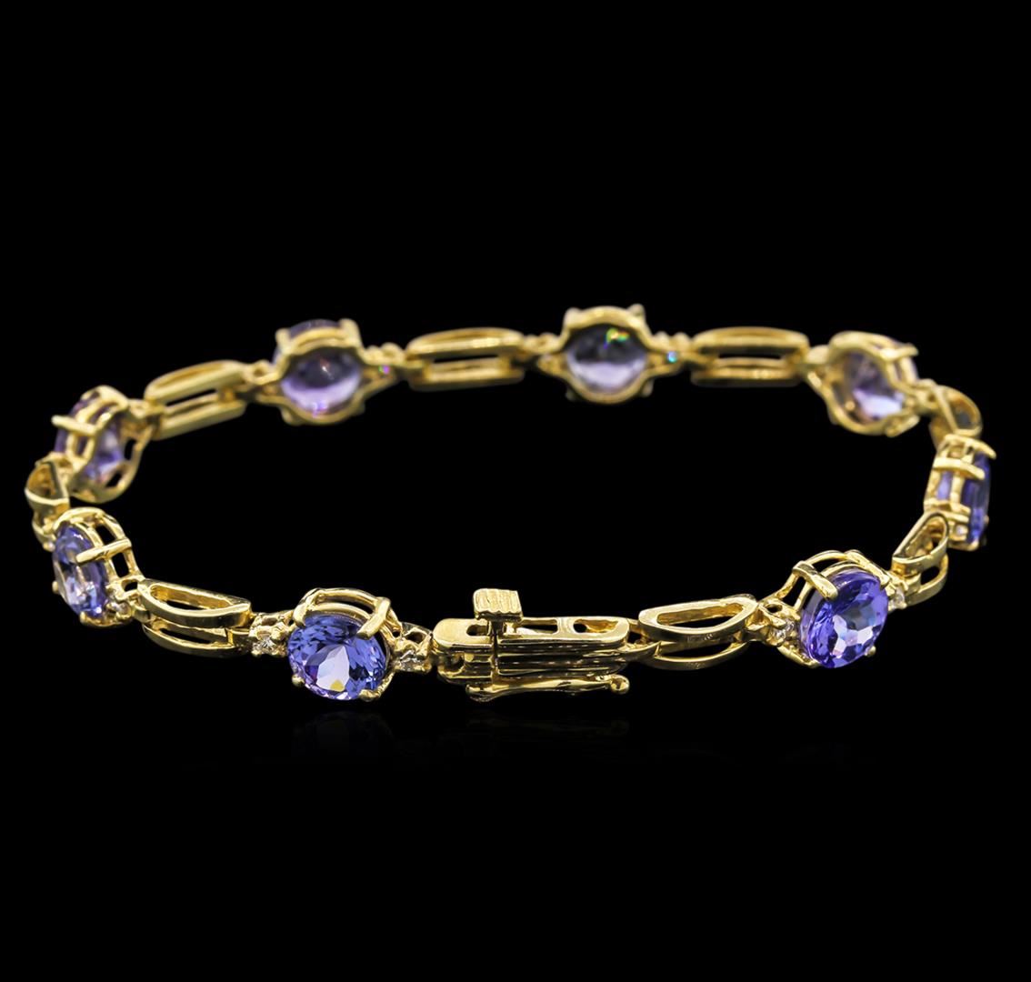 One electronically tested 14KT yellow gold lady's combination cast & assembled ribbon bracelet with a tongue clasp with foldover safety with a bright polish finish. The featured lady's bracelet has a length measuring 7.00 inches. Identified with markings of "14K". Condition is new, good workmanship. Containing: Seven prong set round modified brilliant cut natural tanzanites, measuring 6.70 - 6.60 x 4.26 mm, 5% bulge factor, approximate total weight of 9.45ct., clarity is eye clean, type I, medium light, very slightly grayish, bluish violet color, (GIA bV 4/3), cut is good. Transmitting light with no distortion, transparent. Colored gemstones are presumed to have been subjected to commonly used enhancement processes. Graded in the setting. Sixteen prong set round brilliant cut diamonds, measuring 1.80 - 1.70 x 1.10mm (depth est.) approximate total weight of 16 Stones = 0.33ct. Graded in the setting. Clarity: SI-1 to I-1. Color: H - I. Cut Good. Total Weight of Colored Stones 9.45ct. Total Weight of Diamonds 0.33ct. Total Weight of Bracelet 10.10gm. GAS Appraised at $5,325.00.
