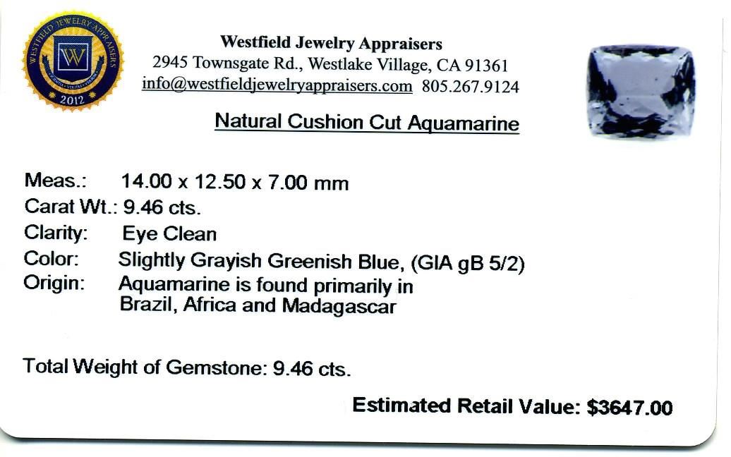 9.46ct. Cushion Cut Natural Cushion Cut Aquamarine. Westfield Appraised at $3,647.00.