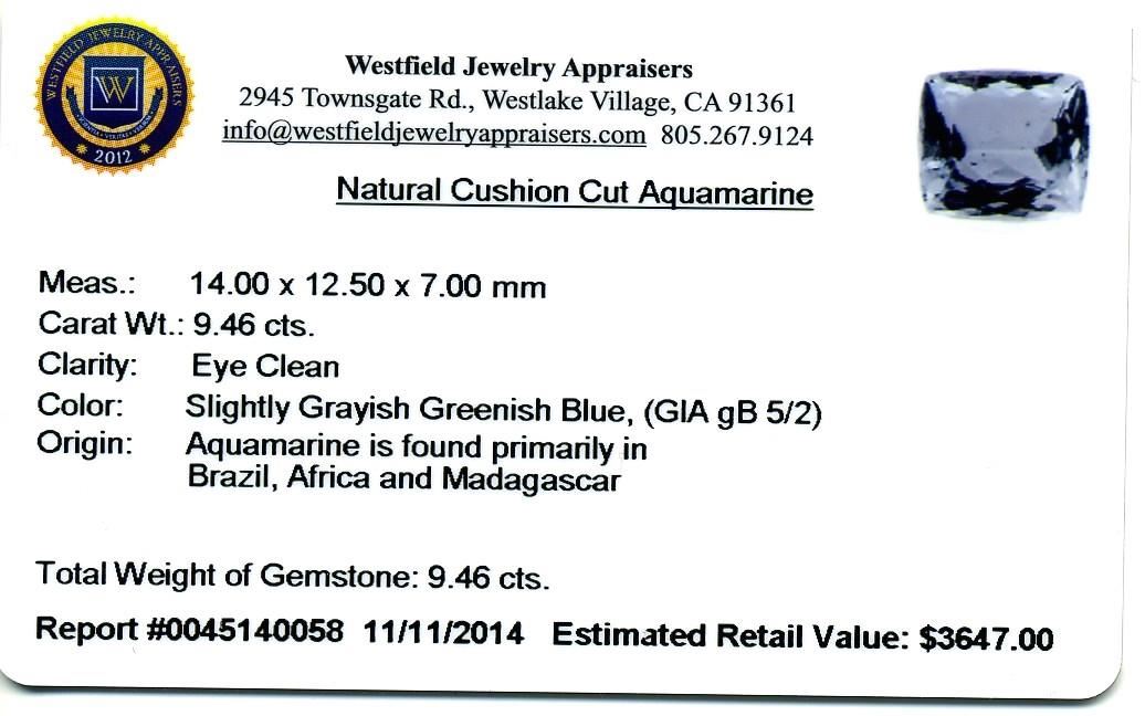 9.46ct. Cushion Cut Natural Cushion Cut Aquamarine. Westfield Appraised at $3,647.00.