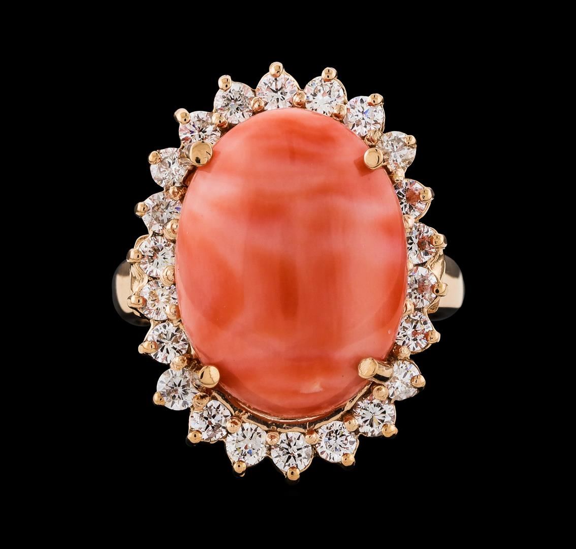One electronically tested 14KT rose gold lady's cast fashion ring with a basket halo with a bright polish finish. The featured lady's ring has a shank measuring 2.57 millimeters wide. Identified with markings of '14K'. Condition is new, good workmanship. Containing: One prong set oval cabochon standard cut natural pink coral, measuring 16.03 x 12.04 x 5.12mm, (depth est.) 20%. bulge factor, approximate weight of 9.47ct., medium light, very slightly brownish, reddish orange color, (GIA rO 4/3), cut is very good. The featured coral has marbled white striations evenly textured throughout the stone. Colored gemstones are presumed to have been subjected to commonly used enhancement processes. Graded in the setting. Twenty-Two prong set round brilliant cut diamonds, measuring 2.20 - 2.10 x 1.33mm (depth est.) approximate total weight of 22 Stones = 0.83ct. Graded in the setting. Clarity SI-1 to SI-2. Color: H - I Cut Good. Total Weight of Colored Stones 9.47ct.. Total Weight of Diamonds 0.83ct.. Total Weight of Ring 7.40gm. GAS Appraised at $4,810.00.