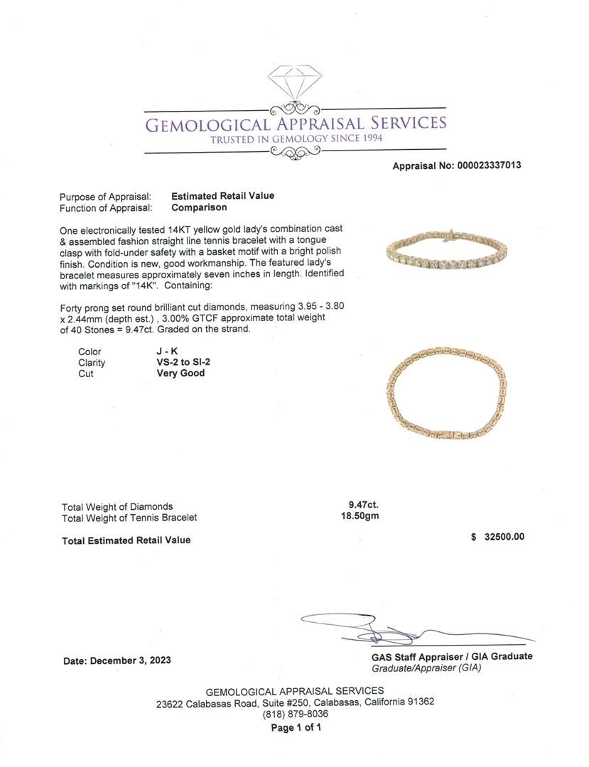One new 9.47 ctw Diamond Tennis Bracelet - 14KT Yellow Gold. Appraisal Value: $32500. See appraisal for full details.