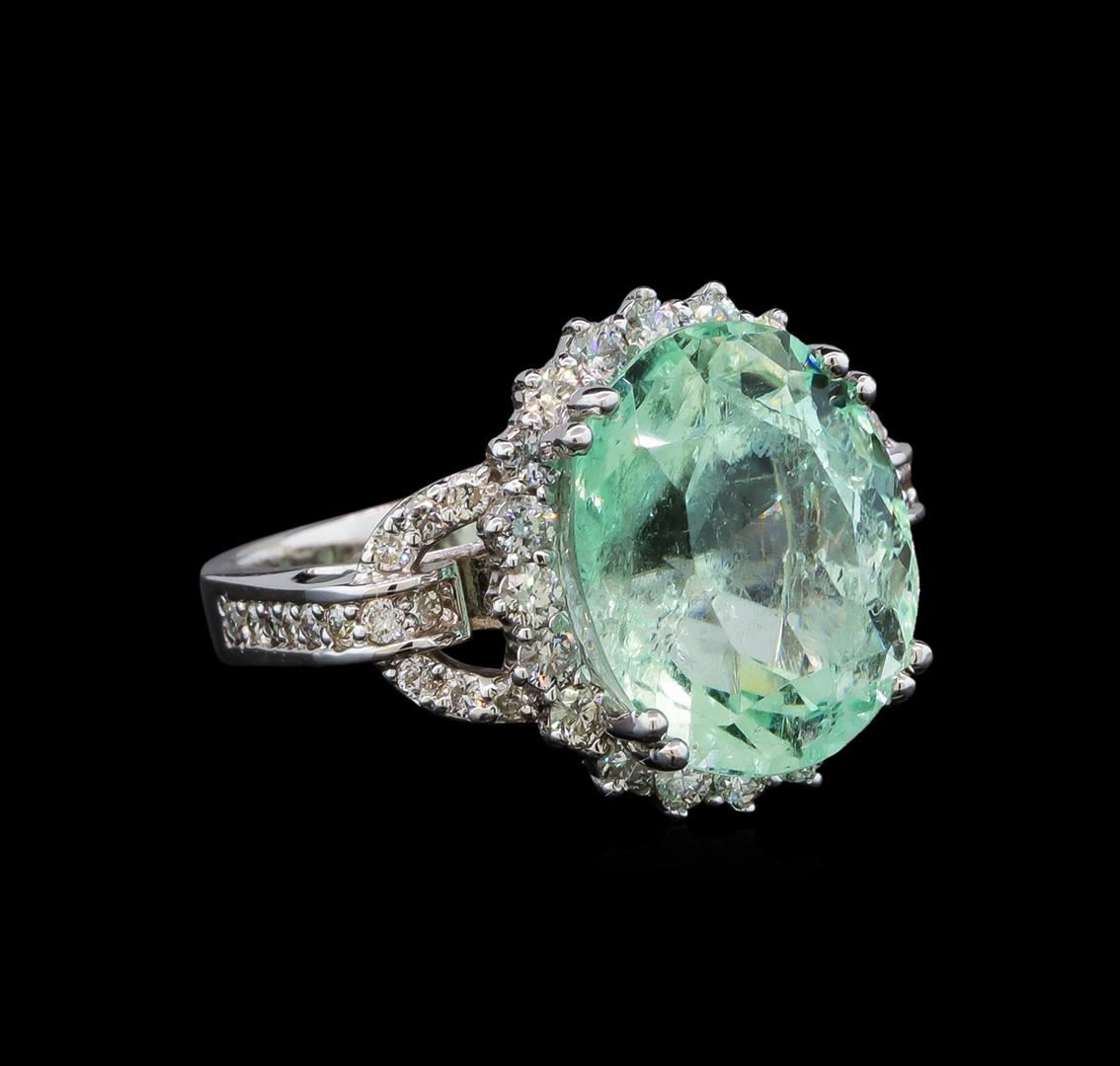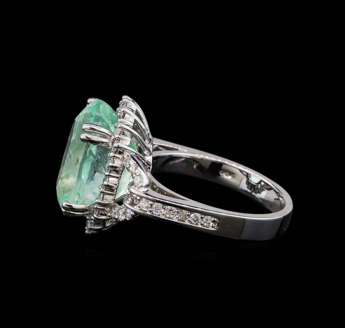 One electronically tested 14KT white gold lady's cast fashion ring with a basket halo with a bright polish finish. The featured lady's ring has a shank measuring 3.11 millimeters wide. Identified with markings of 'K14'. Condition is new, good workmanship. Containing: One prong set oval modified brilliant cut natural emerald, measuring 14.48 x 11.75 x 10.24mm, (depth est.) approximate weight of 9.47ct., clarity is moderately included, light, moderately strong, green color, (GIA G 3/4), cut is very good. Transmitting light somewhat diffusely, transparent to translucent. Naturally occurring internal & external characteristics are present. Indications of oil residue. Colored gemstones are presumed to have been subjected to commonly used enhancement processes. Graded in the setting. Twenty prong set round brilliant cut diamonds, measuring 2.10 - 2.00 x 1.28mm (depth est.) approximate total weight of 20 Stones = 0.65ct. Graded in the setting. Clarity SI-1 to SI-2. Color: H - I Cut Good Twenty-Eight prong set round brilliant cut diamonds, measuring 1.50 - 1.40 x 0.90mm (depth est.) approximate total weight of 28 Stones = 0.33ct. Graded in the setting. Clarity SI-1 to I-1. Color: H - I Cut Good. Total Weight of Colored Stones 9.47ct.. Total Weight of Diamonds 0.98ct.. Total Weight of Ring 7.60gm. GAS Appraised at $12,205.00.