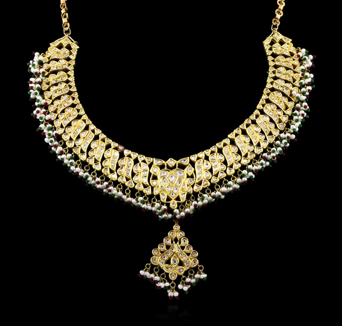 One electronically tested 21KT yellow gold lady's hand fabricated fashion suite with a bright polish with enamel finish. Condition is used, good workmanship. The featured lady's suite contains one pair of friction post dangle earrings and one necklace measuring 18inches long terminating in a wire hook clasp. Containing: Three hundred thirty-nine bezel set rose cut diamonds, measuring 5.40 - 2.50 x 2.45mm (depth est.) approximate total weight of 339 Stones = 55.70ct. Graded in the setting. Clarity: VS-2 to SI-2. Color: G - I. Cut: Poor. 316 Chinese freshwater pearls, 3.5mm in size to 3.0mm in size. The pearls are white in color with a good luster, near round to off round, and mostly clean with good matching. Graded in the setting. One hundred fifty-eight bead cut natural emeralds, measuring 2.10 x 2.00 x 1.30mm, approximate total weight of 4.74ct., clarity is eye clean, type III, medium dark, moderately strong, green color, (GIA G 6/4), cut is good. Colored gemstones are presumed to have been subjected to commonly used enhancement processes. Graded in the setting. One hundred fifty-eight bead cut natural rubies, measuring 2.10 x 2.00 x 1.30mm, approximate total weight of 4.74ct., clarity is eye clean, type II, medium dark, moderately strong, red color, (GIA R 6/4), cut is good. Colored gemstones are presumed to have been subjected to commonly used enhancements processes. Graded in the setting. Total Weight of Colored Stones 9.48ct. Total Weight of Diamonds 55.70ct. Total Weight of Suite 148.80gm. GAS Appraised at $40,395.00.