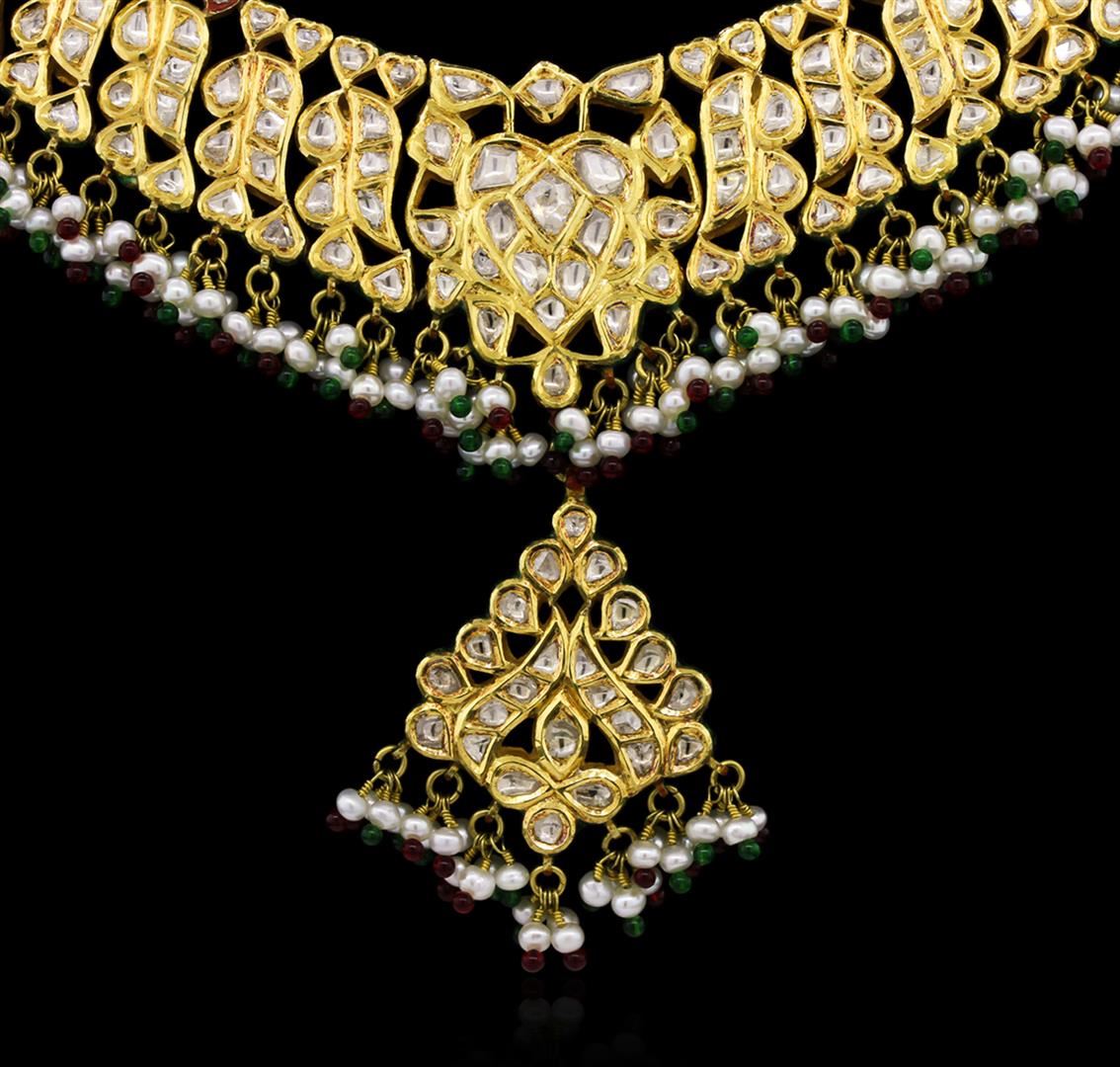 One electronically tested 21KT yellow gold lady's hand fabricated fashion suite with a bright polish with enamel finish. Condition is used, good workmanship. The featured lady's suite contains one pair of friction post dangle earrings and one necklace measuring 18inches long terminating in a wire hook clasp. Containing: Three hundred thirty-nine bezel set rose cut diamonds, measuring 5.40 - 2.50 x 2.45mm (depth est.) approximate total weight of 339 Stones = 55.70ct. Graded in the setting. Clarity: VS-2 to SI-2. Color: G - I. Cut: Poor. 316 Chinese freshwater pearls, 3.5mm in size to 3.0mm in size. The pearls are white in color with a good luster, near round to off round, and mostly clean with good matching. Graded in the setting. One hundred fifty-eight bead cut natural emeralds, measuring 2.10 x 2.00 x 1.30mm, approximate total weight of 4.74ct., clarity is eye clean, type III, medium dark, moderately strong, green color, (GIA G 6/4), cut is good. Colored gemstones are presumed to have been subjected to commonly used enhancement processes. Graded in the setting. One hundred fifty-eight bead cut natural rubies, measuring 2.10 x 2.00 x 1.30mm, approximate total weight of 4.74ct., clarity is eye clean, type II, medium dark, moderately strong, red color, (GIA R 6/4), cut is good. Colored gemstones are presumed to have been subjected to commonly used enhancements processes. Graded in the setting. Total Weight of Colored Stones 9.48ct. Total Weight of Diamonds 55.70ct. Total Weight of Suite 148.80gm. GAS Appraised at $40,395.00.