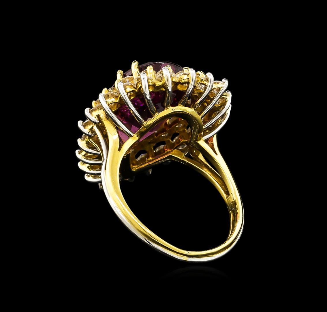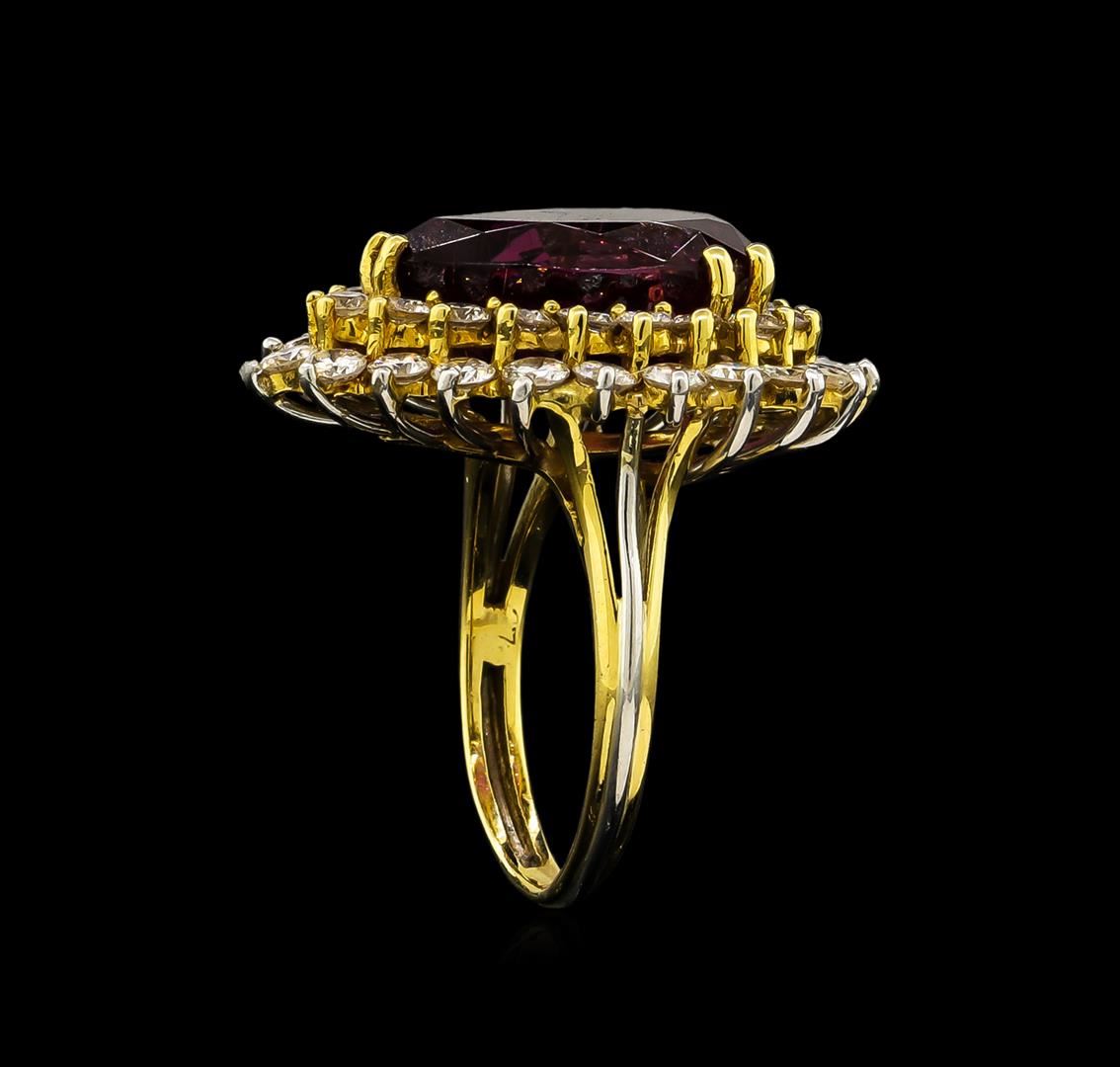 One electronically tested 18KT white and yellow gold lady's hand assembled double halo ring with a basket wire mounting with a bright polish finish. The featured ladies' ring has a shank measuring 2.10 millimeters. Condition is used, good workmanship. Containing: One prong set pear modified brilliant cut natural rhodolite garnet, measuring 16.20 x 10.68 x 7.27mm, approximate weight of 9.50ct., clarity is eye clean, type II, medium, moderately strong, reddish purple color, (GIA rP 5/4), cut is very good. Colored gemstones are presumed to have been subjected to commonly used enhancement processes. Graded in the setting. Twenty-Two prong set round brilliant cut diamonds, measuring 2.70 - 2.60 x 1.64mm (depth est.) approximate total weight of 22 Stones = 1.55ct. Graded in the setting. Clarity: VS-1 to VS-2. Color: I - J. Cut Good Nineteen prong set round brilliant cut diamonds, measuring 2.50 - 2.40 x 1.52mm (depth est.) approximate total weight of 19 Stones = 1.10ct. Diamond is chipped. Graded in the setting. Clarity: VS-1 to VS-2. Color: H - I. Cut Good. Total Weight of Colored Stones 9.50ct. Total Weight of Diamonds 2.65ct. Total Weight of Ring 8.60gm. GAS Appraised at $8,005.00.
