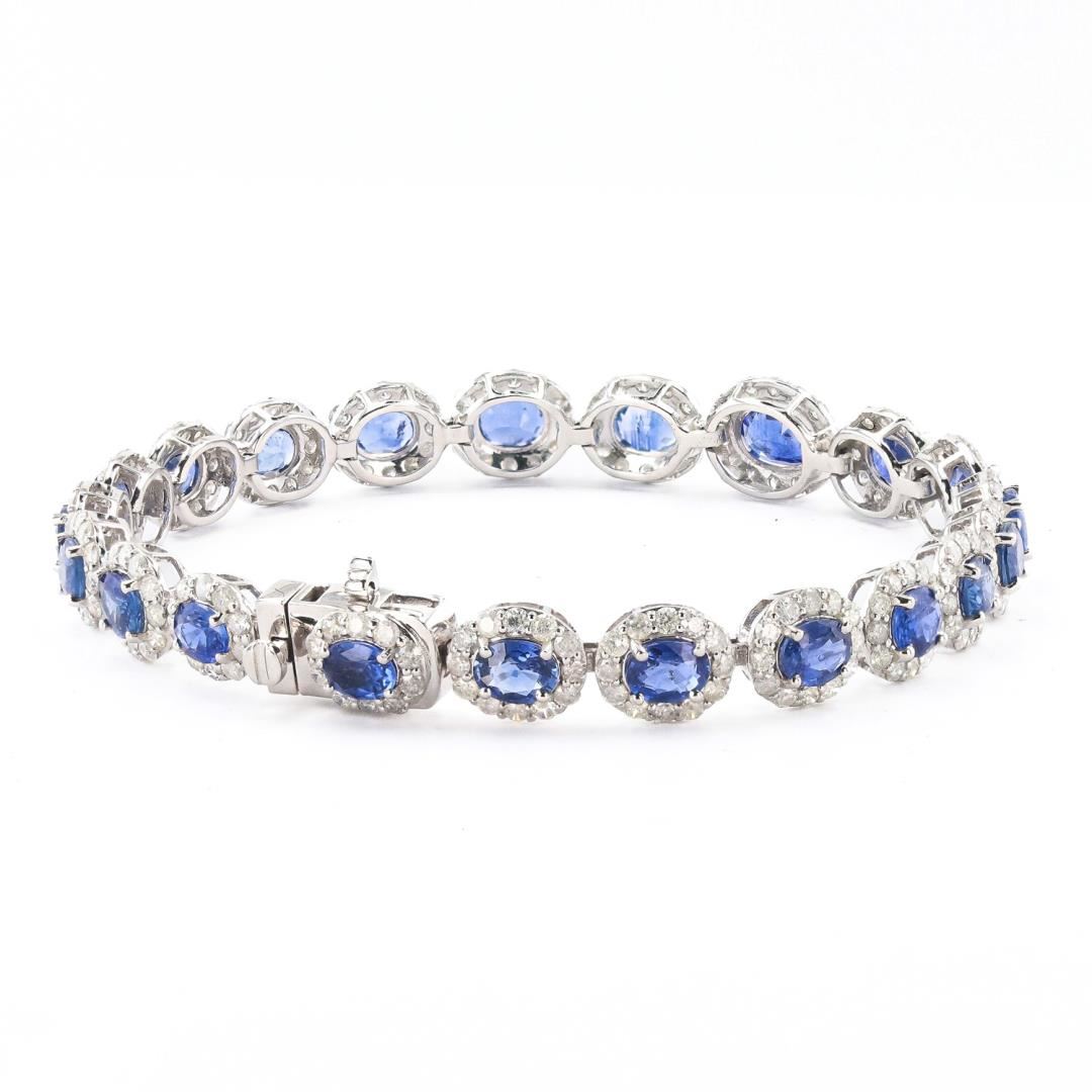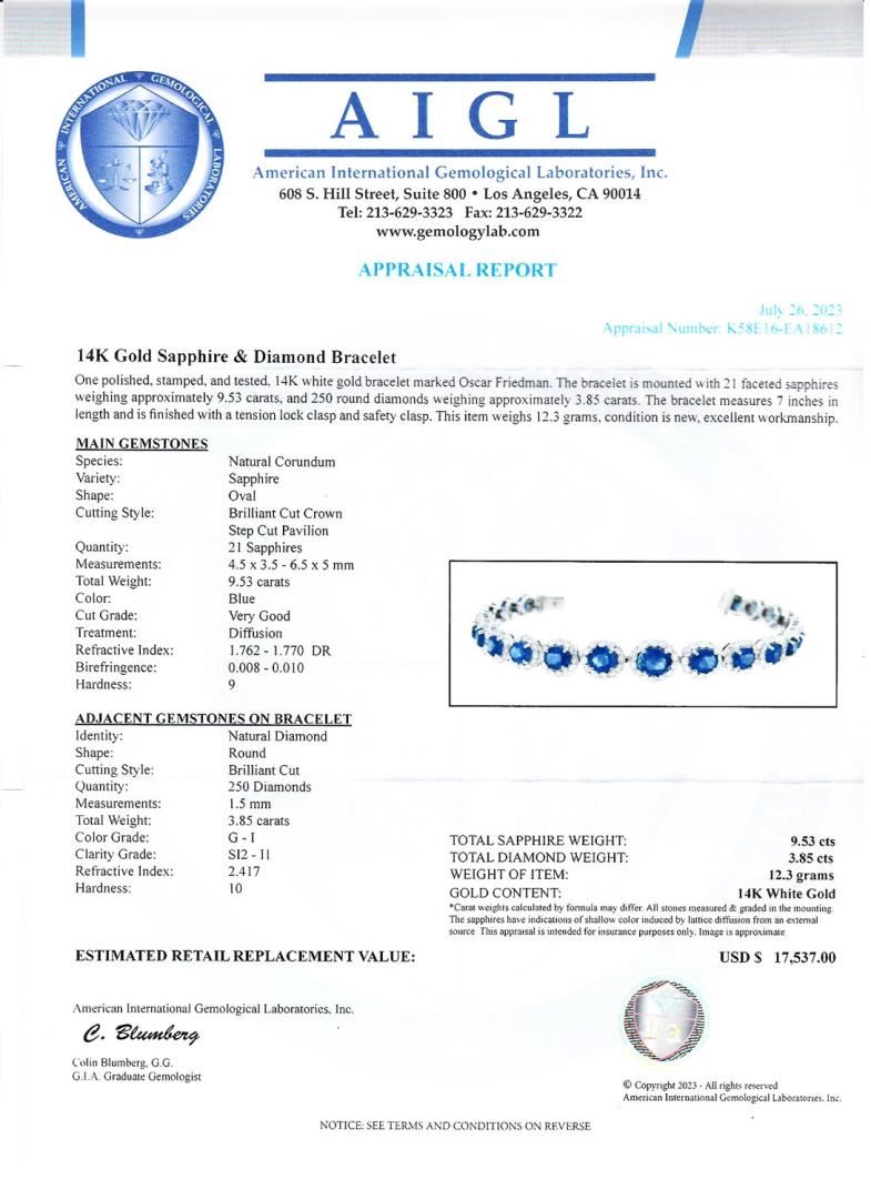 One polished. stamped, and tested. 14K white gold bracelet marked Oscar Friedman. The bracelet is mounted with 21 faceted sapphires weighing approximately 9.53 carats, and 250 round diamonds weighing approximately 3.85 carats. The bracelet measures 7 inches in length and is finished with a tension lock clasp and safety clasp. This item weighs 12.3 grams, condition is new, excellent workmanship. #MAIN GEMSTONES# Species: Natural Corundum Variety: Sapphire Shape: Oval Cutting Style: Brilliant Cut Crown, Step Cut Pavilion Quantity: 21 Sapphires Measurements: 45 x 3.5 - 6.5 x 5mm Total Weight: 9.53 carats Color: Blue Cut Grade: Very Good Treatment: Diffusion Refractive Index: 1.762 - 1.770 DR Birefringence: 0.008 - 0.010 Hardness: 9 #ADJACENT GEMSTONES ON BRACELET# Identity: Natural Diamond Shape: Round Cutting Style: Brilliant Cut Quantity: 250 Diamonds Measurements: 1.5mm Total Weight: 3.85 carats Color Grade: G-I Clarity Grade: SI2-I1 Refractive Index: 2.417 Hardness: 10 TOTAL SAPPHIRE WEIGHT: 9.53 cts TOTAL DIAMOND WEIGHT: 3.85 cts WEIGHT OF ITEM: 12.3 grams GOLD CONTENT: 14K White Gold #LREF-5816