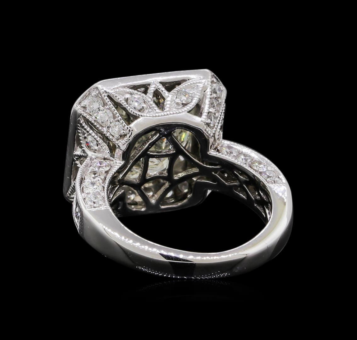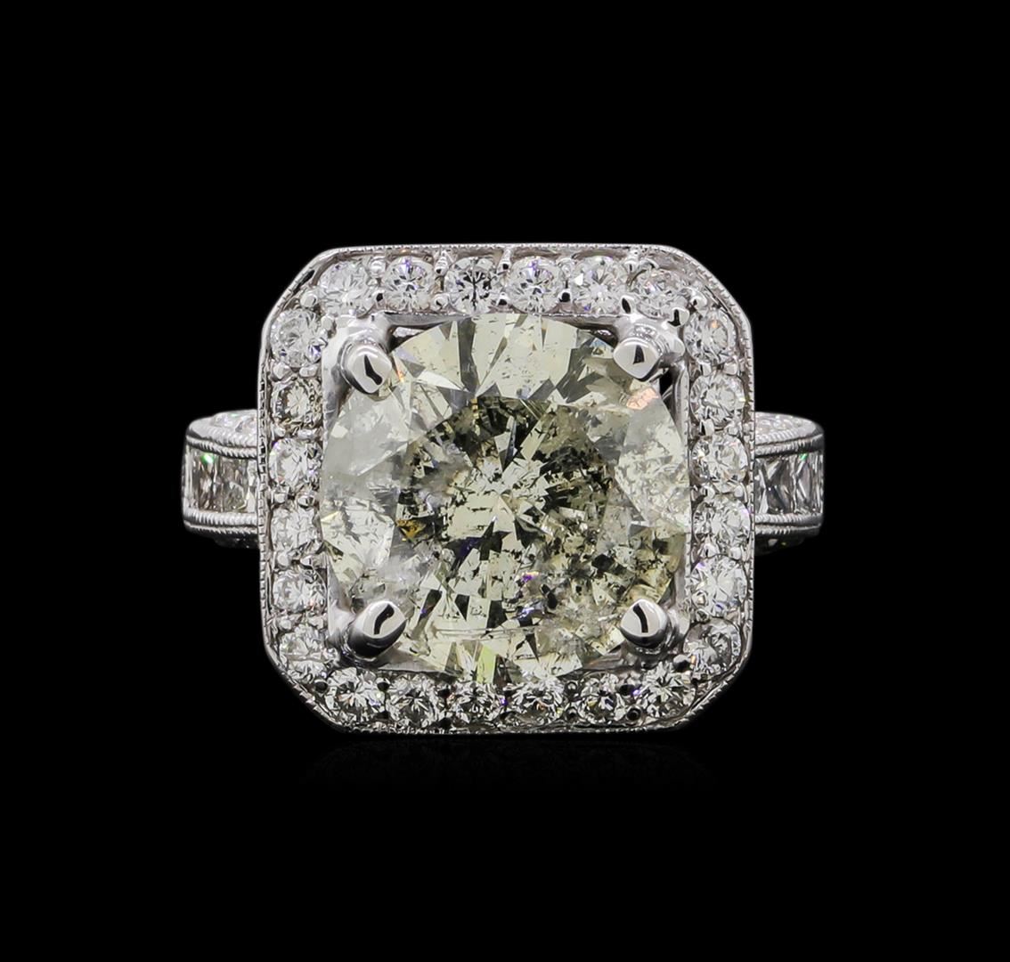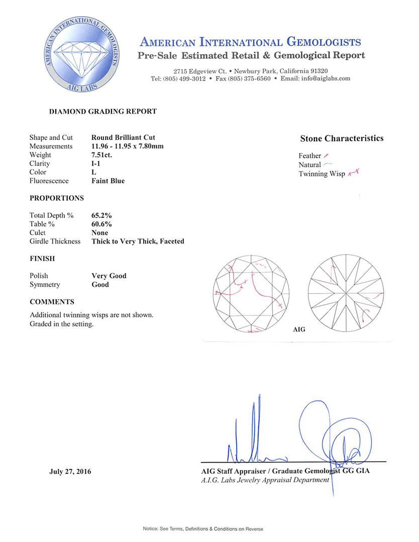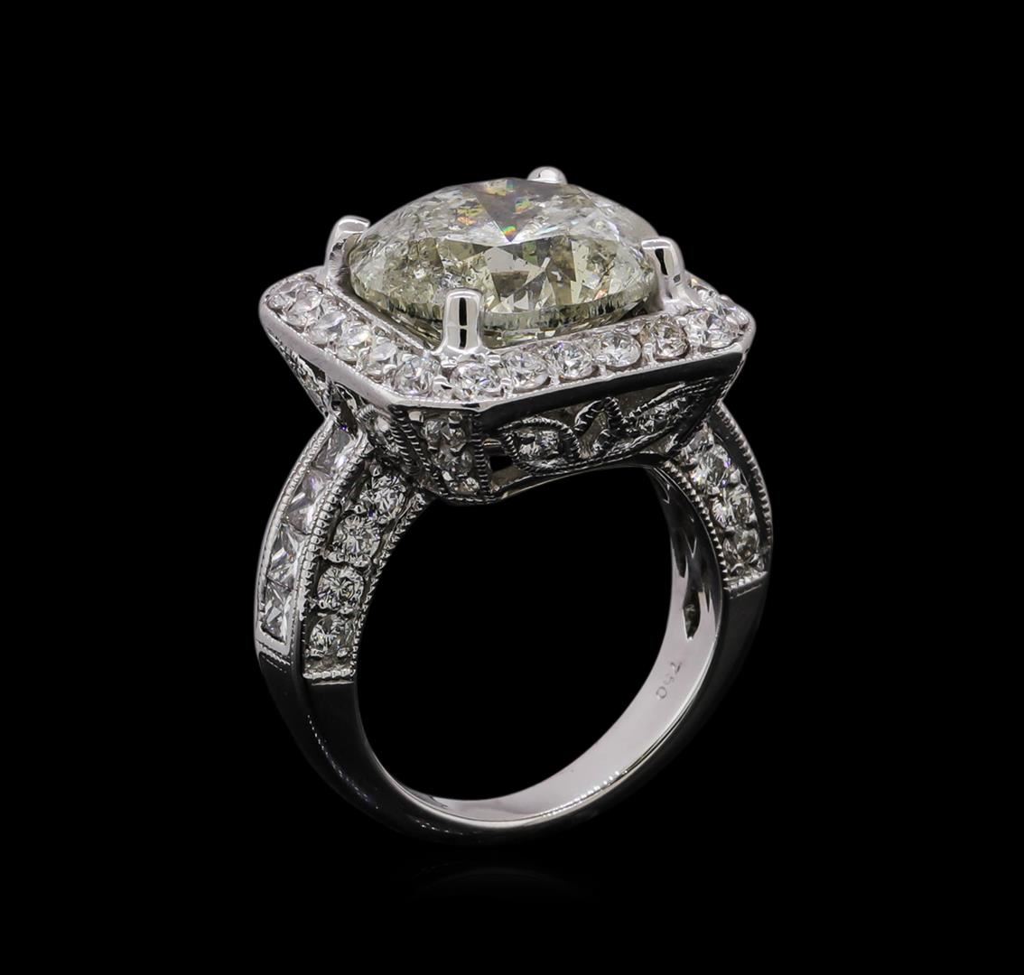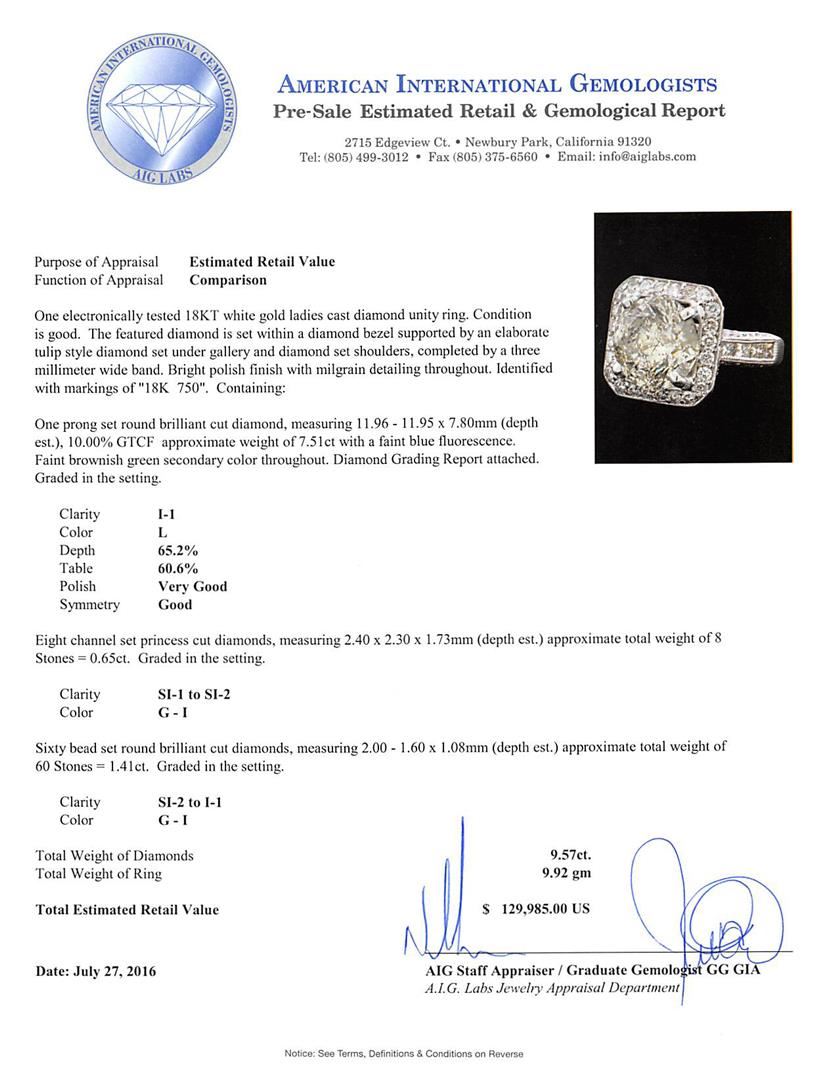 One electronically tested 18KT white gold ladies cast diamond unity ring. The featured diamond is set within a diamond bezel supported by an elaborate tulip style diamond set under gallery and diamond set shoulders, completed by a three millimeter wide band. Bright polish finish with milgrain detailing throughout. Identified with markings of '18K 750'. Condition is good. Containing: One prong set round brilliant cut diamond, measuring 11.96 - 11.95 x 7.80mm (depth est.), 10.00.%. GTCF approximate weight of 7.51ct with a faint blue fluorescence. Faint brownish green secondary color throughout. Diamond Grading Report attached. Graded in the setting. Clarity I-1. Color: L Depth 65.2%. Table: 60.6%. Eight channel set princess cut diamonds, measuring 2.40 x 2.30 x 1.73mm (depth est.) approximate total weight of 8 Stones = 0.65ct. Graded in the setting. Clarity SI-1 to SI-2. Color: G - I Sixty bead set round brilliant cut diamonds, measuring 2.00 - 1.60 x 1.08mm (depth est.) approximate total weight of 60 Stones = 1.41ct. Graded in the setting. Clarity SI-2 to I-1. Color: G - I. Total Weight of Diamonds 9.57ct.. Total Weight of Ring 9.92gm. AIG Appraised at $129,985.00.