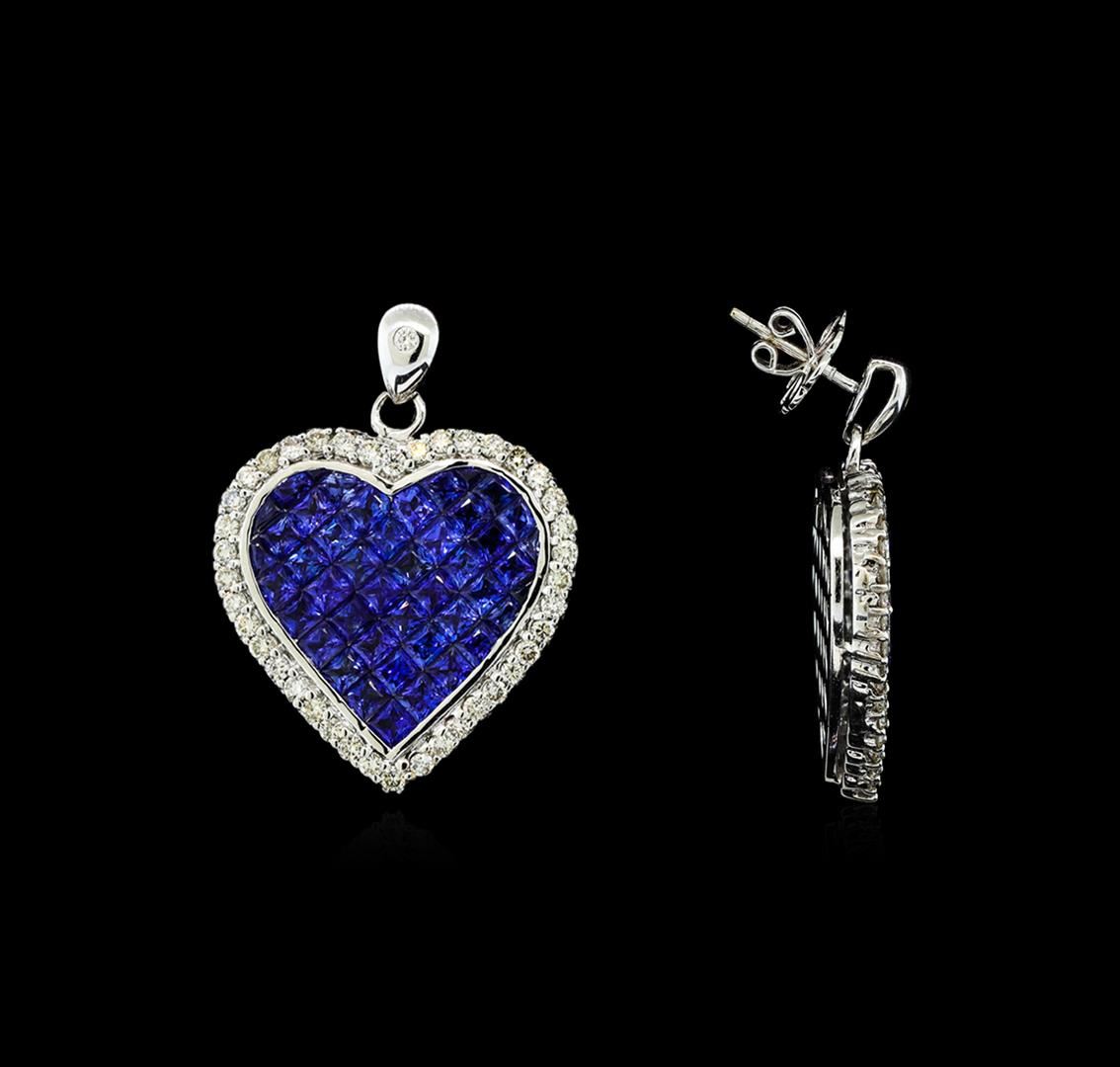 One pair electronically tested 18KT white gold lady's combination cast & assembled heart shape dangle earrings with heavy friction backs with a bright polish finish. The featured pair of lady's earrings have a drop of 32.5 millimeters. Identified with markings of '18K'. Condition is new, good workmanship. Containing: Ninety invisible set princess modified brilliant cut natural blue sapphires, measuring 2.60 x 2.30 x 1.50mm, (depth est.) approximate total weight of 9.58ct., clarity is eye clean, medium, moderately strong, blue color, (GIA B 5/4), cut is very good. Transmitting light with no distortion, transparent. Colored gemstones are presumed to have been subjected to commonly used enhancement processes. Graded in the setting. Eighty prong set round brilliant cut diamonds, measuring 1.70 - 1.65 x 1.04mm (depth est.) approximate total weight of 80 Stones = 1.45ct. Graded in the setting. Clarity VS-2 to SI-1. Color: H - I Cut Good Two bezel set round brilliant cut diamonds, measuring 1.50 - 1.45 x 0.92mm (depth est.) approximate total weight of 2 Stones = 0.02ct. Graded in the setting. Clarity SI-1. Color: I Cut Good. Total Weight of Colored Stones 9.58ct.. Total Weight of Diamonds 1.47ct.. Total Weight of Earrings 18.00gm GAS Appraised at $16,360.00.