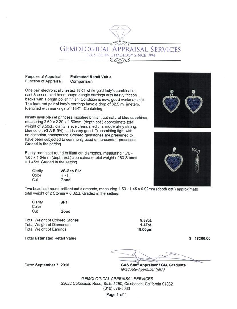 One pair electronically tested 18KT white gold lady's combination cast & assembled heart shape dangle earrings with heavy friction backs with a bright polish finish. The featured pair of lady's earrings have a drop of 32.5 millimeters. Identified with markings of '18K'. Condition is new, good workmanship. Containing: Ninety invisible set princess modified brilliant cut natural blue sapphires, measuring 2.60 x 2.30 x 1.50mm, (depth est.) approximate total weight of 9.58ct., clarity is eye clean, medium, moderately strong, blue color, (GIA B 5/4), cut is very good. Transmitting light with no distortion, transparent. Colored gemstones are presumed to have been subjected to commonly used enhancement processes. Graded in the setting. Eighty prong set round brilliant cut diamonds, measuring 1.70 - 1.65 x 1.04mm (depth est.) approximate total weight of 80 Stones = 1.45ct. Graded in the setting. Clarity VS-2 to SI-1. Color: H - I Cut Good Two bezel set round brilliant cut diamonds, measuring 1.50 - 1.45 x 0.92mm (depth est.) approximate total weight of 2 Stones = 0.02ct. Graded in the setting. Clarity SI-1. Color: I Cut Good. Total Weight of Colored Stones 9.58ct.. Total Weight of Diamonds 1.47ct.. Total Weight of Earrings 18.00gm GAS Appraised at $16,360.00.