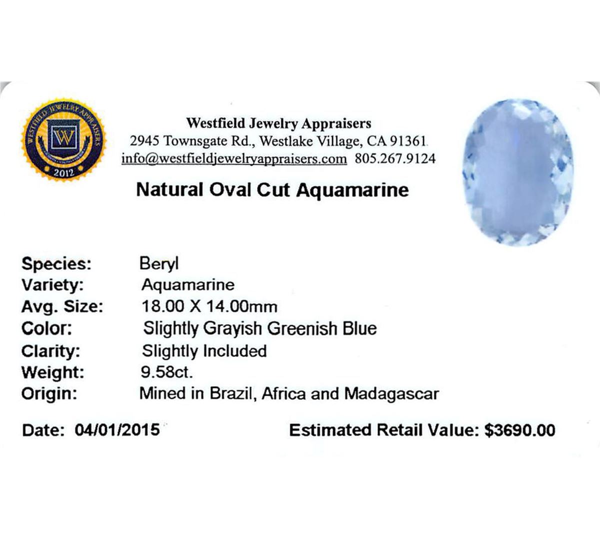One oval cut natural aquamarine exact weight 9.58ct., clarity is slightly included, type I, medium light, very slightly grayish, very slightly greenish blue color, (GIA vslgB 4/3), cut is good. Westfield Appraised at $3,690.00.