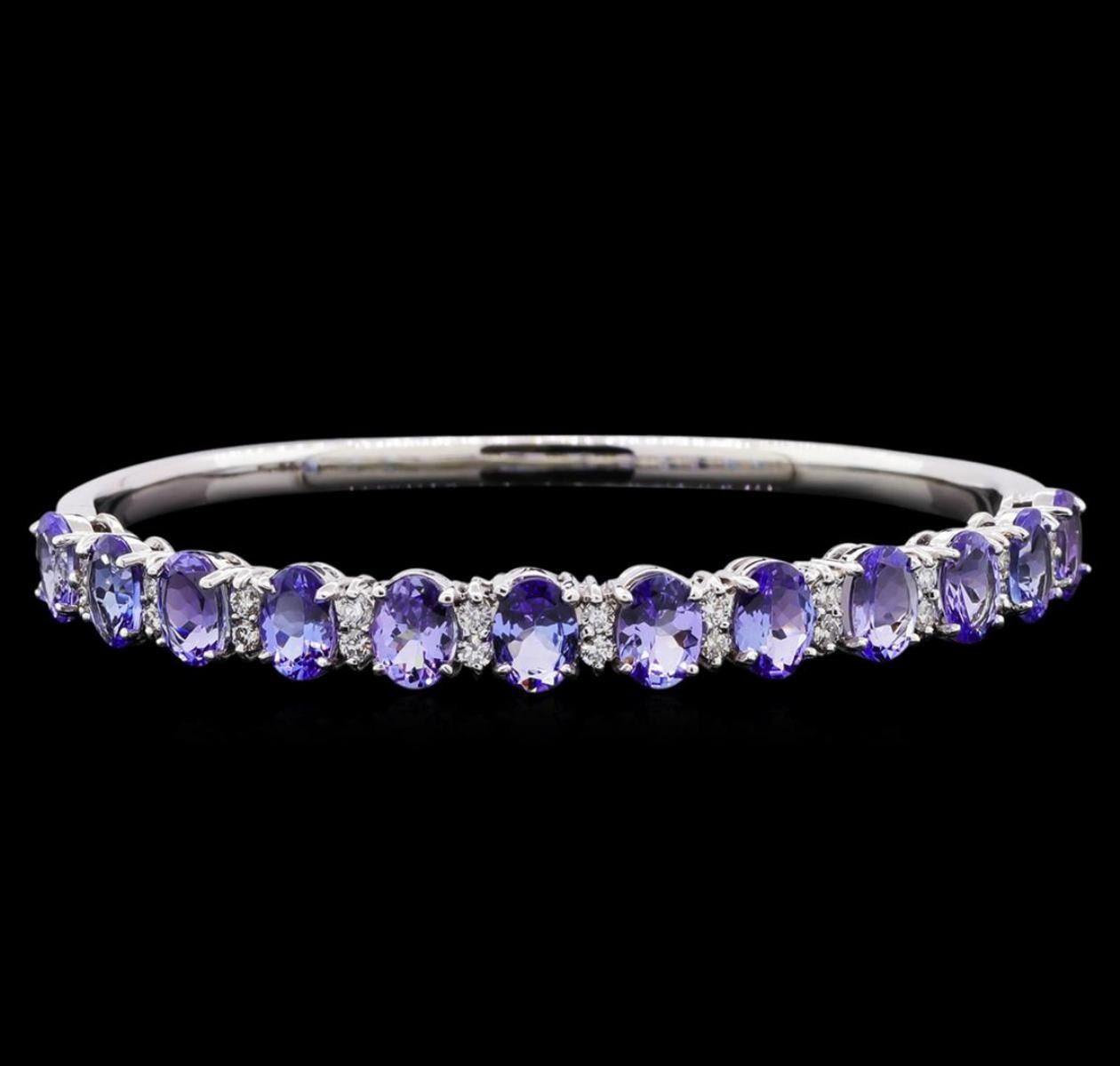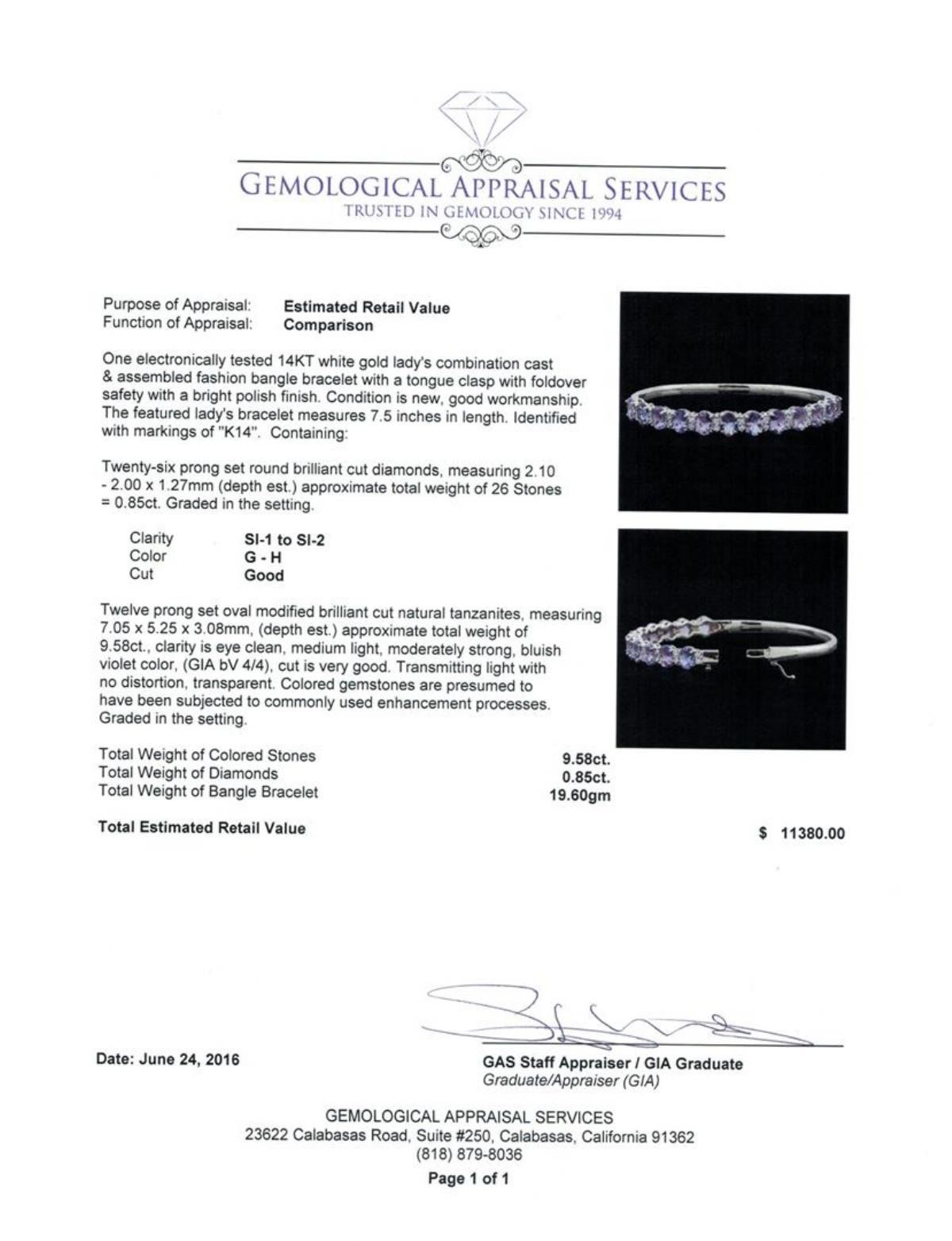 One electronically tested 14KT white gold lady's combination cast & assembled fashion bangle bracelet with a tongue clasp with foldover safety with a bright polish finish. The featured lady's bracelet measures 7.5 inches in length. Identified with markings of "K14". Condition is new, good workmanship. Containing: Twenty-Six prong set round brilliant cut diamonds, measuring 2.10 - 2.00 x 1.27mm (depth est.) approximate total weight of 26 Stones = 0.85ct. Graded in the setting. Clarity: SI-1 to SI-2. Color: G - Good Twelve prong set oval modified brilliant cut natural tanzanites, measuring 7.05 x 5.25 x 3.08mm, (depth est.) approximate total weight of 9.58ct., clarity is eye clean, medium light, moderately strong, bluish violet color, (GIA bV 4/4), cut is very good. Transmitting light with no distortion, transparent. Colored gemstones are presumed to have been subjected to commonly used enhancement processes. Graded in the setting. Total Weight of Colored Stones 9.58ct. Total Weight of Diamonds 0.85ct. Total Weight of Bangle Bracelet 19.60gm. GAS Appraised.
