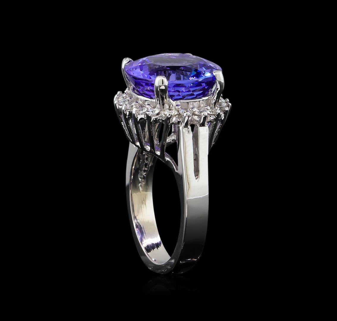 One electronically tested 14KT white gold ladies cast tanzanite and diamond ring with a bright polish finish. The featured tanzanite is set within a diamond bezel supported by a raised lattice under gallery, completed by a three millimeter wide band. Identified with markings of "14K". Condition is new, good workmanship. Containing: One prong set round mixed cut natural tanzanite, measuring 13.35 - 13.30 x 8.30 mm, approximate weight of 9.58ct., clarity is eye clean, type I, medium dark, very slightly grayish, bluish violet color, (GIA bV 6/3), cut is good. Transmitting light with no distortion, transparent. Colored Stone Grading Report attached. Graded in the setting. Tanzanite is a very rare gemstone that is only found in the country of Tanzania. Originally discovered in 1967. Tiffany & Company, named the stone Tanzanite. It is found in the Usumburu Mountains that border the Umba Valley of northern Tanzania. Tanzanite occurs in gray, brown, violet, blue, reddish-purple, & green. The gem is interesting because of its exceptional pleochroism. Rotated in different directions a tanzanite will exhibit multiple changes of color. Tanzanite has a low tolerance to ultrasonic cleaning, and should not be cleaned using this method. Twenty prong set round brilliant cut diamonds approximate total weight of 20 Stones = 0.48ct. Graded in the setting. Clarity: SI-1 to SI-2. Color: E - G. Total Weight of Colored Stones 9.58ct. Total Weight of Diamonds 0.48ct. Total Weight of Ring 9.28gm. AIG Appraised at $24,005.00.