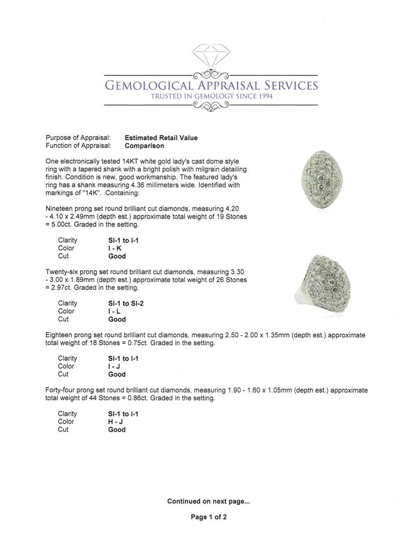 One electronically tested 14KT white gold lady's cast dome style ring with a tapered shank with a bright polish with milgrain detailing finish. The featured lady's ring has a shank measuring 4.36 millimeters wide. Identified with markings of "14K". Condition is new, good workmanship. Containing: Nineteen prong set round brilliant cut diamonds, measuring 4.20 - 4.10 x 2.49mm (depth est.) approximate total weight of 19 Stones = 5.00ct. Graded in the setting. Clarity: SI-1 to I-1. Color: I - K. Cut Good Twenty-Six prong set round brilliant cut diamonds, measuring 3.30 - 3.00 x 1.89mm (depth est.) approximate total weight of 26 Stones = 2.97ct. Graded in the setting. Clarity: SI-1 to SI-2. Color: I - L. Cut Good Eighteen prong set round brilliant cut diamonds, measuring 2.50 - 2.00 x 1.35mm (depth est.) approximate total weight of 18 Stones = 0.75ct. Graded in the setting. Clarity: SI-1 to I-1. Color: I - Good Forty-Four prong set round brilliant cut diamonds, measuring 1.90 - 1.60 x 1.05mm (depth est.) approximate total weight of 44 Stones = 0.86ct. Graded in the setting. Clarity: SI-1 to I-1. Color: H - Good. Total Weight of Diamonds 9.58ct. Total Weight of Ring 19.60gm. GAS Appraised at $13,455.00.