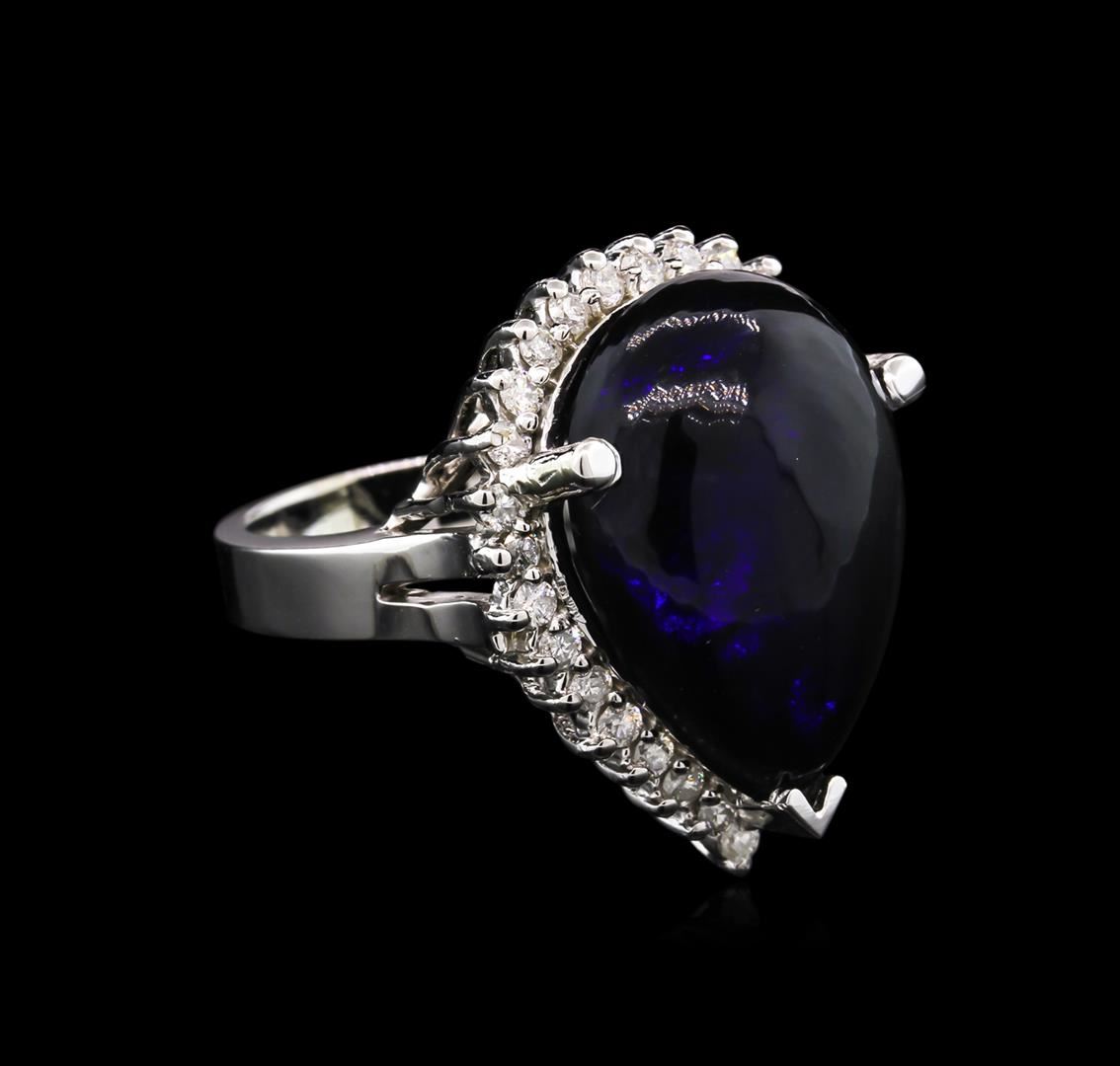One electronically tested 14KT white gold ladies cast opal & diamond ring with a bright finish. Condition is new, good workmanship. The featured opal is set within a diamond bezel, supported by a ribbed under gallery, completed bya three millimeter wide band. Identified with markings of "14K". Containing: One black opal that is cut in a pear shaped cabochon and is prong set, measuring21.00 mm long x 16.00 mm wide, and 6.98 mm thick and the exact weight is 9.59carats. The opal has a quite bright, blue only play of color (fire) in a pattern; a high dome; a good cut; slightly included in its brightness and pattern; and is . Graded in the setting. Thirty prong set round brilliant cut diamonds approximate total weight of 30 Stones = 0.77ct. Graded in the setting. Clarity: I-1 to I-2.Color: H - I. AIG Appraised at $5,990.00.