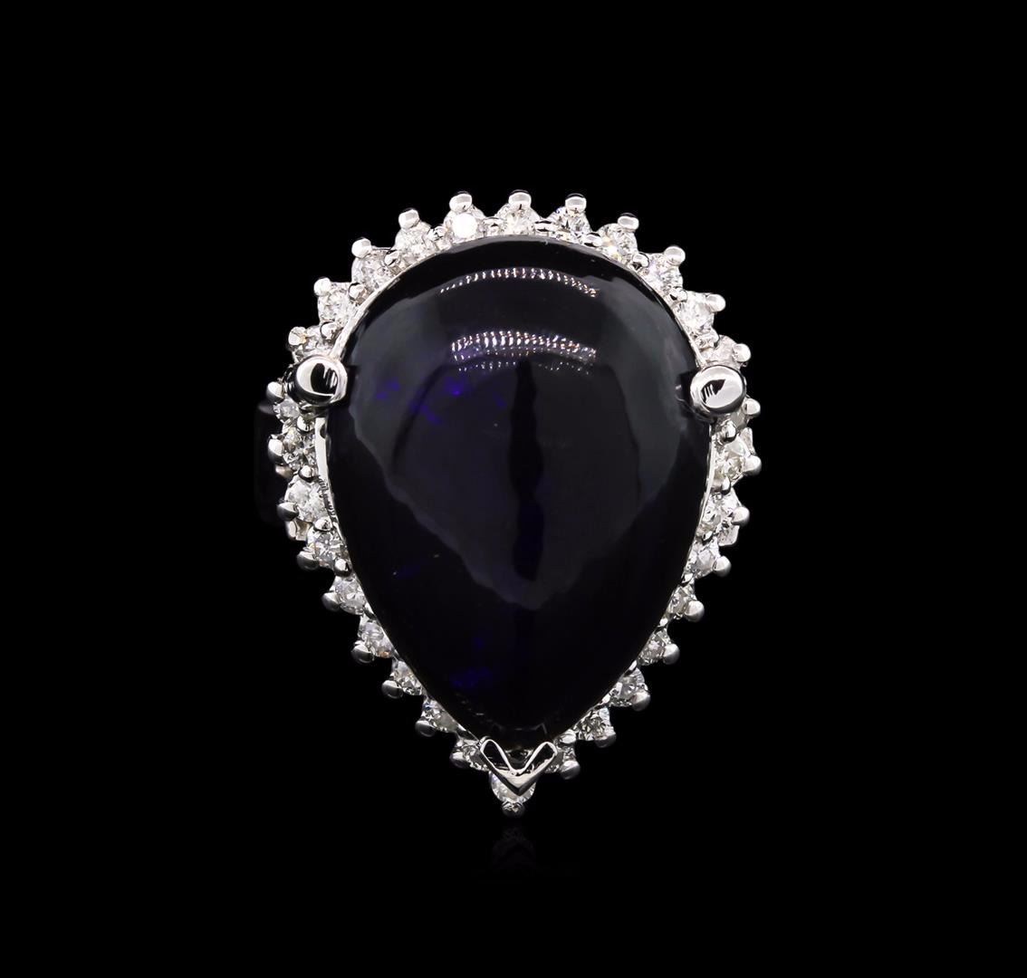 One electronically tested 14KT white gold ladies cast opal & diamond ring with a bright finish. Condition is new, good workmanship. The featured opal is set within a diamond bezel, supported by a ribbed under gallery, completed bya three millimeter wide band. Identified with markings of "14K". Containing: One black opal that is cut in a pear shaped cabochon and is prong set, measuring21.00 mm long x 16.00 mm wide, and 6.98 mm thick and the exact weight is 9.59carats. The opal has a quite bright, blue only play of color (fire) in a pattern; a high dome; a good cut; slightly included in its brightness and pattern; and is . Graded in the setting. Thirty prong set round brilliant cut diamonds approximate total weight of 30 Stones = 0.77ct. Graded in the setting. Clarity: I-1 to I-2.Color: H - I. AIG Appraised at $5,990.00.