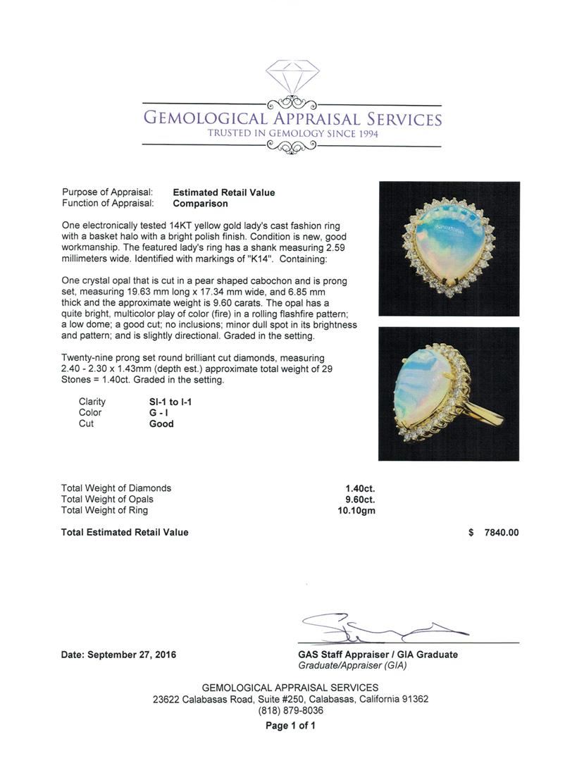 One electronically tested 14KT yellow gold lady's cast fashion ring with a basket halo with a bright polish finish. The featured lady's ring has a shank measuring 2.59 millimeters wide. Identified with markings of 'K14'. Condition is new, good workmanship. Containing: One crystal opal that is cut in a pear shaped cabochon and is prong set, measuring 19.63 mm long x 17.34 mm wide, and 6.85 mm thick and the approximate weight is 9.60 carats. The opal has a quite bright, multicolor play of color (fire) in a rolling flashfire pattern; a low dome; a good cut; no inclusions; minor dull spot in its brightness and pattern; and is slightly directional. Graded in the setting. Twenty-Nine prong set round brilliant cut diamonds, measuring 2.40 - 2.30 x 1.43mm (depth est.) approximate total weight of 29 Stones = 1.40ct. Graded in the setting. Clarity SI-1 to I-1. Color: G - I Cut Good. Total Weight of Diamonds 1.40ct.. Total Weight of Opals 9.60ct.. Total Weight of Ring 10.10gm. GAS Appraised at $7,840.00.