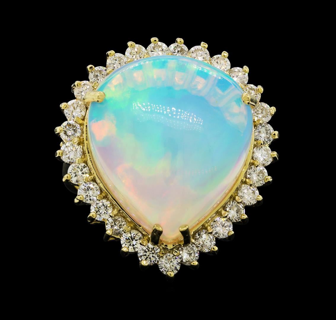 One electronically tested 14KT yellow gold lady's cast fashion ring with a basket halo with a bright polish finish. The featured lady's ring has a shank measuring 2.59 millimeters wide. Identified with markings of 'K14'. Condition is new, good workmanship. Containing: One crystal opal that is cut in a pear shaped cabochon and is prong set, measuring 19.63 mm long x 17.34 mm wide, and 6.85 mm thick and the approximate weight is 9.60 carats. The opal has a quite bright, multicolor play of color (fire) in a rolling flashfire pattern; a low dome; a good cut; no inclusions; minor dull spot in its brightness and pattern; and is slightly directional. Graded in the setting. Twenty-Nine prong set round brilliant cut diamonds, measuring 2.40 - 2.30 x 1.43mm (depth est.) approximate total weight of 29 Stones = 1.40ct. Graded in the setting. Clarity SI-1 to I-1. Color: G - I Cut Good. Total Weight of Diamonds 1.40ct.. Total Weight of Opals 9.60ct.. Total Weight of Ring 10.10gm. GAS Appraised at $7,840.00.