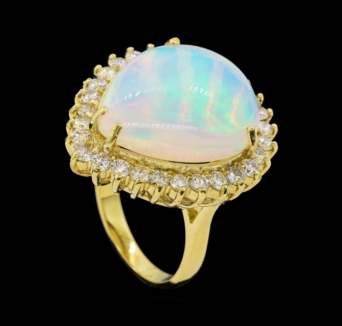 One electronically tested 14KT yellow gold lady's cast fashion ring with a basket halo with a bright polish finish. The featured lady's ring has a shank measuring 2.59 millimeters wide. Identified with markings of 'K14'. Condition is new, good workmanship. Containing: One crystal opal that is cut in a pear shaped cabochon and is prong set, measuring 19.63 mm long x 17.34 mm wide, and 6.85 mm thick and the approximate weight is 9.60 carats. The opal has a quite bright, multicolor play of color (fire) in a rolling flashfire pattern; a low dome; a good cut; no inclusions; minor dull spot in its brightness and pattern; and is slightly directional. Graded in the setting. Twenty-Nine prong set round brilliant cut diamonds, measuring 2.40 - 2.30 x 1.43mm (depth est.) approximate total weight of 29 Stones = 1.40ct. Graded in the setting. Clarity SI-1 to I-1. Color: G - I Cut Good. Total Weight of Diamonds 1.40ct.. Total Weight of Opals 9.60ct.. Total Weight of Ring 10.10gm. GAS Appraised at $7,840.00.