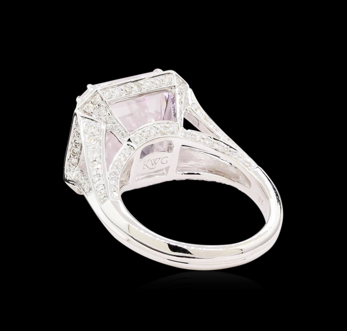 One electronically tested 18KT white gold lady's cast fashion ring with a cathedral split shank with a halo with a bright polish finish. The featured lady's ring has a shank measuring 3.20 millimeters wide. Trademark is KWG. Identified with markings of "18K 750". Condition is new, good workmanship. Containing: One prong set square emerald modified step cut natural kunzite, measuring 12.15 x 12.13 x 8.20mm, approximate weight of 9.61ct., clarity is eye clean, type I, light, very slightly grayish, reddish purple color, (GIA rP 3/3), cut is very good. Transmitting light with no distortion, transparent. Colored gemstones are presumed to have been subjected to commonly used enhancement processes. Graded in the setting. One Hundred Sixty-Eight bead set round brilliant cut diamonds, measuring 1.40 - 1.10 x 0.75mm (depth est.) approximate total weight of 168 Stones = 1.18ct. Graded in the setting. Clarity: VS-1 to SI-1. Color: G - Very Good. Total Weight of Colored Stones 9.61ct. Total Weight of Diamonds 1.18ct. Total Weight of Ring 11.60gm. GAS Appraised at $9,375.00.