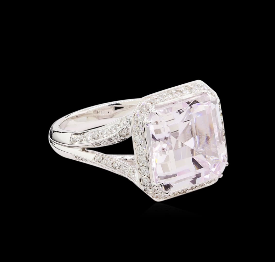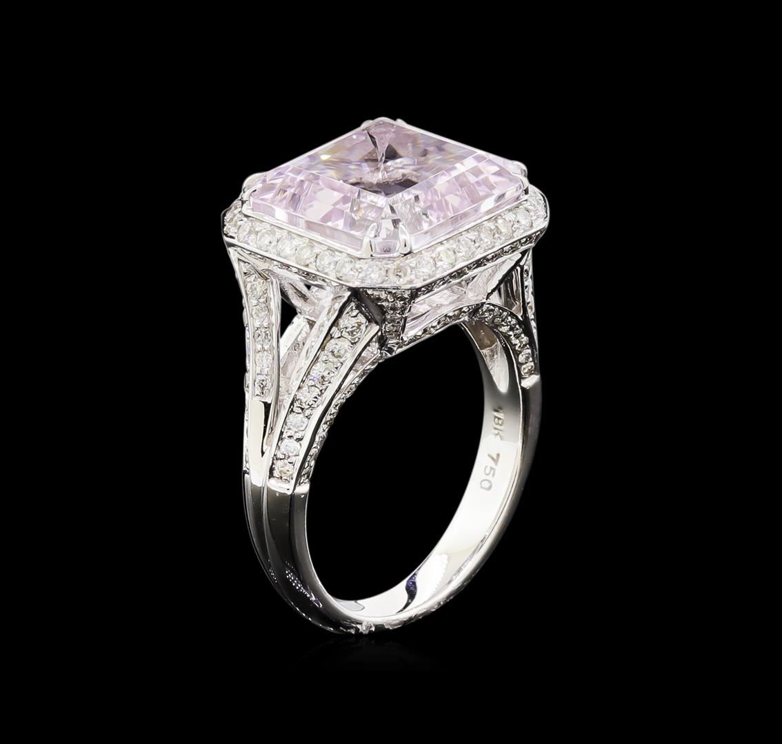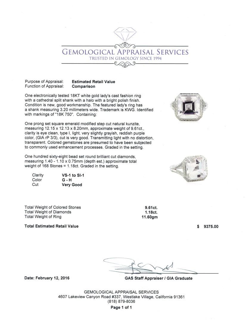 One electronically tested 18KT white gold lady's cast fashion ring with a cathedral split shank with a halo with a bright polish finish. The featured lady's ring has a shank measuring 3.20 millimeters wide. Trademark is KWG. Identified with markings of "18K 750". Condition is new, good workmanship. Containing: One prong set square emerald modified step cut natural kunzite, measuring 12.15 x 12.13 x 8.20mm, approximate weight of 9.61ct., clarity is eye clean, type I, light, very slightly grayish, reddish purple color, (GIA rP 3/3), cut is very good. Transmitting light with no distortion, transparent. Colored gemstones are presumed to have been subjected to commonly used enhancement processes. Graded in the setting. One Hundred Sixty-Eight bead set round brilliant cut diamonds, measuring 1.40 - 1.10 x 0.75mm (depth est.) approximate total weight of 168 Stones = 1.18ct. Graded in the setting. Clarity: VS-1 to SI-1. Color: G - Very Good. Total Weight of Colored Stones 9.61ct. Total Weight of Diamonds 1.18ct. Total Weight of Ring 11.60gm. GAS Appraised at $9,375.00.