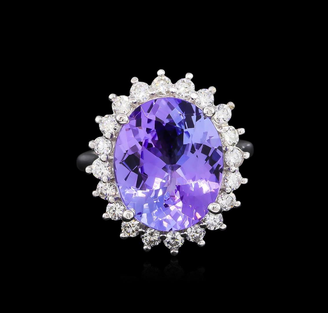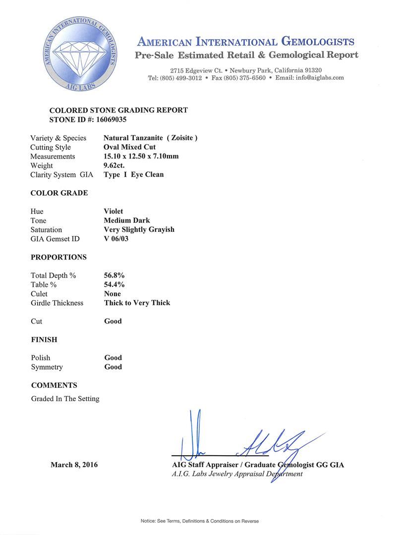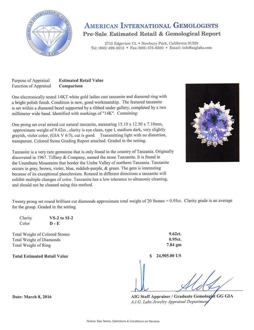 One electronically tested 14KT white gold ladies cast tanzanite and diamond ring with a bright polish finish. The featured tanzanite is set within a diamond bezel supported by a ribbed under gallery, completed by a two millimeter wide band. Identified with markings of "14K". Condition is new, good workmanship. Containing: One prong set oval mixed cut natural tanzanite, measuring 15.10 x 12.50 x 7.10mm, approximate weight of 9.62ct., clarity is eye clean, type I, medium dark, very slightly grayish, violet color, (GIA V 6/3), cut is good. Transmitting light with no distortion, transparent. Colored Stone Grading Report attached. Graded in the setting. Tanzanite is a very rare gemstone that is only found in the country of Tanzania. Originally discovered in 1967. Tiffany & Company, named the stone Tanzanite. It is found in the Usumburu Mountains that border the Umba Valley of northern Tanzania. Tanzanite occurs in gray, brown, violet, blue, reddish-purple, & green. The gem is interesting because of its exceptional pleochroism. Rotated in different directions a tanzanite will exhibit multiple changes of color. Tanzanite has a low tolerance to ultrasonic cleaning, and should not be cleaned using this method. Twenty prong set round brilliant cut diamonds approximate total weight of 20 Stones = 0.95ct. Clarity grade is an average for the group. Graded in the setting. Clarity: VS-2 to SI-2. Color: D - E. Total Weight of Colored Stones 9.62ct. Total Weight of Diamonds 0.95ct. Total Weight of Ring 7.84gm. AIG Appraised at $24,905.00.