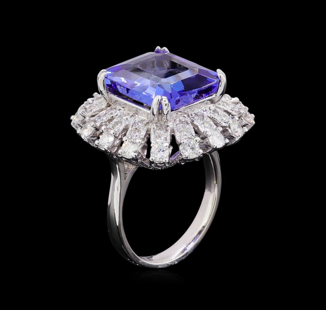 One electronically tested 14KT white gold lady's cast fashion ring with a basket halo with a bright polish with milgrain detailing finish. The featured lady's ring has a shank measuring 2.90 millimeters wide. Identified with markings of "14K". Condition is new, good workmanship. Containing: One prong set emerald step cut natural tanzanite, measuring 13.90 x 12.06 x 6.57mm, approximate weight of 9.62ct., clarity is eye clean, type I, medium, moderately strong, violetish blue color, (GIA vB 5/4), cut is very good. Transmitting light with no distortion, transparent. Colored gemstones are presumed to have been subjected to commonly used enhancement processes. Graded in the setting. Sixteen prong set round brilliant cut diamonds, measuring 2.60 - 2.50 x 1.53mm (depth est.) approximate total weight of 16 Stones = 0.98ct. Graded in the setting. Clarity: VS-2 to SI-1. Color: H - I. Cut Very Good Thirty-Two prong set round brilliant cut diamonds, measuring 1.60 - 1.55 x 0.98mm (depth est.) approximate total weight of 32 Stones = 0.48ct. Graded in the setting. Clarity: SI-1 to SI-2. Color: H - I. Cut Good. Total Weight of Colored Stones 9.62ct. Total Weight of Diamonds 1.46ct. Total Weight of Ring 9.60gm. GAS Appraised at $20,315.00.