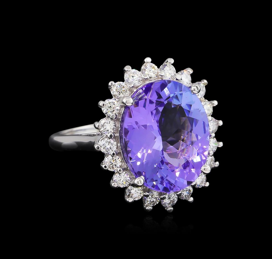One electronically tested 14KT white gold ladies cast tanzanite and diamond ring with a bright polish finish. The featured tanzanite is set within a diamond bezel supported by a ribbed under gallery, completed by a two millimeter wide band. Identified with markings of "14K". Condition is new, good workmanship. Containing: One prong set oval mixed cut natural tanzanite, measuring 15.10 x 12.50 x 7.10mm, approximate weight of 9.62ct., clarity is eye clean, type I, medium dark, very slightly grayish, violet color, (GIA V 6/3), cut is good. Transmitting light with no distortion, transparent. Colored Stone Grading Report attached. Graded in the setting. Tanzanite is a very rare gemstone that is only found in the country of Tanzania. Originally discovered in 1967. Tiffany & Company, named the stone Tanzanite. It is found in the Usumburu Mountains that border the Umba Valley of northern Tanzania. Tanzanite occurs in gray, brown, violet, blue, reddish-purple, & green. The gem is interesting because of its exceptional pleochroism. Rotated in different directions a tanzanite will exhibit multiple changes of color. Tanzanite has a low tolerance to ultrasonic cleaning, and should not be cleaned using this method. Twenty prong set round brilliant cut diamonds approximate total weight of 20 Stones = 0.95ct. Clarity grade is an average for the group. Graded in the setting. Clarity: VS-2 to SI-2. Color: D - E. Total Weight of Colored Stones 9.62ct. Total Weight of Diamonds 0.95ct. Total Weight of Ring 7.84gm. AIG Appraised at $24,905.00.