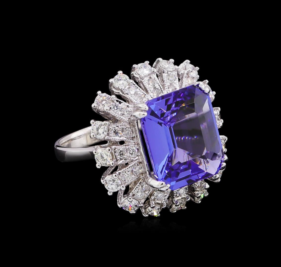 One electronically tested 14KT white gold lady's cast fashion ring with a basket halo with a bright polish with milgrain detailing finish. The featured lady's ring has a shank measuring 2.90 millimeters wide. Identified with markings of "14K". Condition is new, good workmanship. Containing: One prong set emerald step cut natural tanzanite, measuring 13.90 x 12.06 x 6.57mm, approximate weight of 9.62ct., clarity is eye clean, type I, medium, moderately strong, violetish blue color, (GIA vB 5/4), cut is very good. Transmitting light with no distortion, transparent. Colored gemstones are presumed to have been subjected to commonly used enhancement processes. Graded in the setting. Sixteen prong set round brilliant cut diamonds, measuring 2.60 - 2.50 x 1.53mm (depth est.) approximate total weight of 16 Stones = 0.98ct. Graded in the setting. Clarity: VS-2 to SI-1. Color: H - I. Cut Very Good Thirty-Two prong set round brilliant cut diamonds, measuring 1.60 - 1.55 x 0.98mm (depth est.) approximate total weight of 32 Stones = 0.48ct. Graded in the setting. Clarity: SI-1 to SI-2. Color: H - I. Cut Good. Total Weight of Colored Stones 9.62ct. Total Weight of Diamonds 1.46ct. Total Weight of Ring 9.60gm. GAS Appraised at $20,315.00.