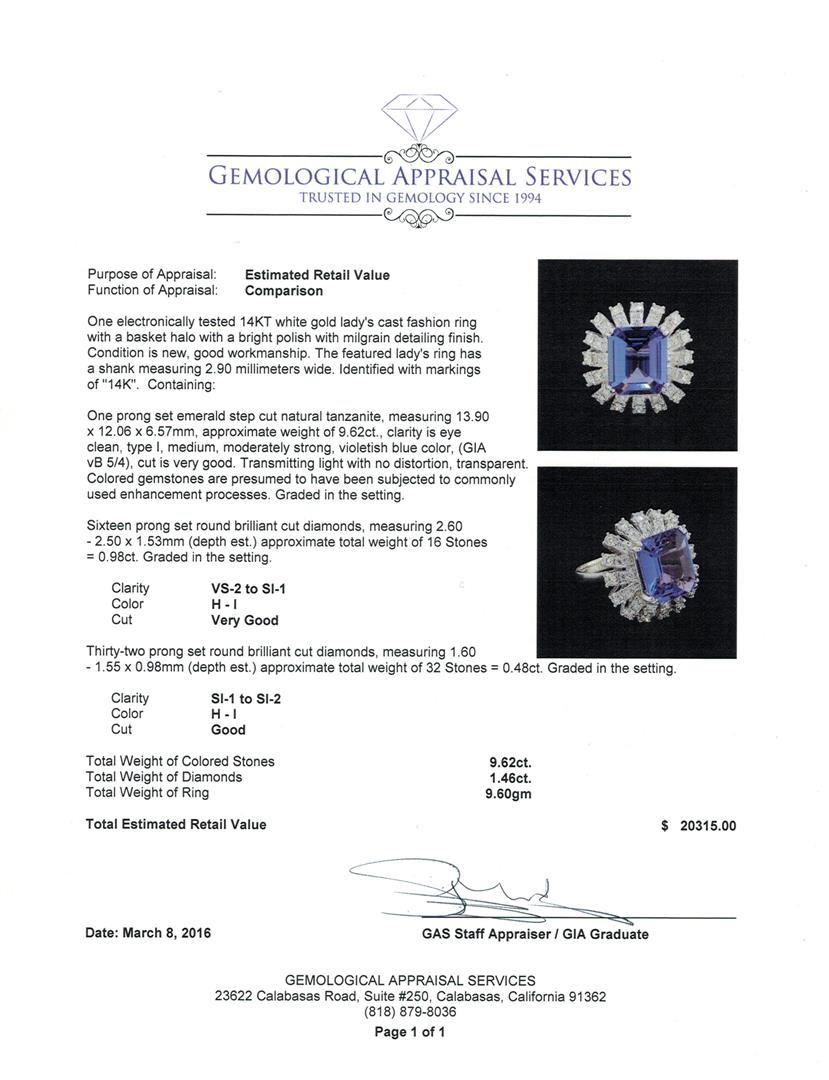 One electronically tested 14KT white gold lady's cast fashion ring with a basket halo with a bright polish with milgrain detailing finish. The featured lady's ring has a shank measuring 2.90 millimeters wide. Identified with markings of "14K". Condition is new, good workmanship. Containing: One prong set emerald step cut natural tanzanite, measuring 13.90 x 12.06 x 6.57mm, approximate weight of 9.62ct., clarity is eye clean, type I, medium, moderately strong, violetish blue color, (GIA vB 5/4), cut is very good. Transmitting light with no distortion, transparent. Colored gemstones are presumed to have been subjected to commonly used enhancement processes. Graded in the setting. Sixteen prong set round brilliant cut diamonds, measuring 2.60 - 2.50 x 1.53mm (depth est.) approximate total weight of 16 Stones = 0.98ct. Graded in the setting. Clarity: VS-2 to SI-1. Color: H - I. Cut Very Good Thirty-Two prong set round brilliant cut diamonds, measuring 1.60 - 1.55 x 0.98mm (depth est.) approximate total weight of 32 Stones = 0.48ct. Graded in the setting. Clarity: SI-1 to SI-2. Color: H - I. Cut Good. Total Weight of Colored Stones 9.62ct. Total Weight of Diamonds 1.46ct. Total Weight of Ring 9.60gm. GAS Appraised at $20,315.00.